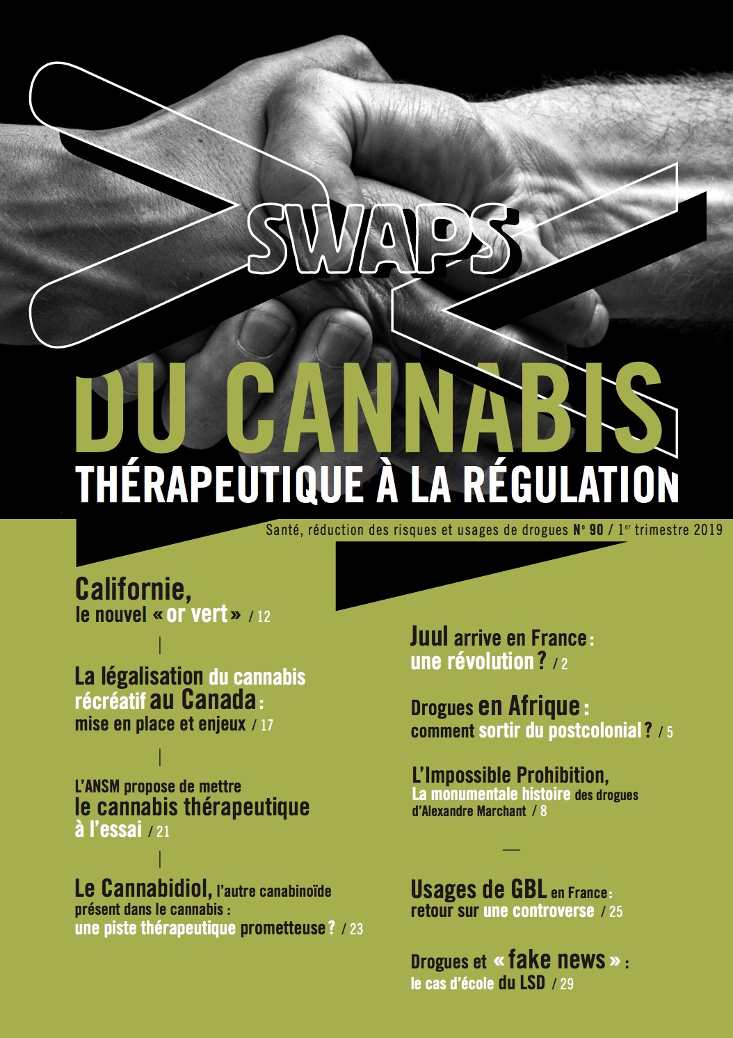 S’agissant de la disponibilité du cannabis thérapeutique en France, la ministre de la santé, Agnès Buzyn, avait quelque peu entrouvert la porte: «C’est peut-être un retard que la France a pris quant à la recherche et au développement du cannabis médical. D’autres pays l’ont fait. (…) il n’y a aucune raison d’exclure, sous prétexte que c’est du cannabis, une molécule qui peut être intéressante pour le traitement de certaines dou- leurs très invalidantes». De fait, l’Agence nationale de sécurité du médicament (ANSM) a annoncé récemment la création d’un comité scientifique spécialisé sur «l’évaluation de la pertinence et de la faisabilité de la mise à disposition du cannabis thérapeutique en France». Une façon de combler notre retard. À petit pas, puisque c’est la Haute Autorité de santé (HAS) qui met à disposition les médicaments et non l’ANSM qui gère les autorisations temporaires d’utilisation (ATU). Selon l’OFDT, une vingtaine de pays européens, 12 pays hors UE et 29 États américains ont d’ores et déjà autorisé le cannabis thérapeutique, sous des formes plus ou moins contraignantes. C’est à partir de cette actualité que cette quatre-vingt-dixième livraison de Swaps a été tissée. Des pistes de recherche sur d’éventuels traitements de substitution existent, à l’instar du cannabidiol (CBD), l’autre cannabinoïde présent dans le cannabis qui peut être inhalé par cigarette électronique. En espérant que ne se reproduise pas l’échec, pour cause d’effets secondaires, des cannabinoïdes de synthèse dans la dépendance au tabac chez l’homme.