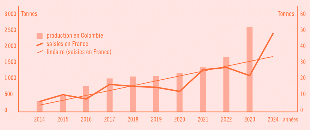 La Colombie étant le principal pourvoyeur du marché européen, les flux l’alimentant ne risquent pas de se tarir. D’ailleurs, en 2023, les saisies dans l’Union européenne ont atteint un nouveau record avec plus de 410 tonnes, contre 323 en 2022, dont 116 tonnes dans le port d’Anvers qui faisait jusqu’à récemment figure de première porte d’entrée de la cocaïne en Europe. En France, l’année 2024 a été marquée par des saisies exceptionnelles de presque 50 tonnes. Bien au-dessus du précédent record de 27,7 tonnes de 2022.