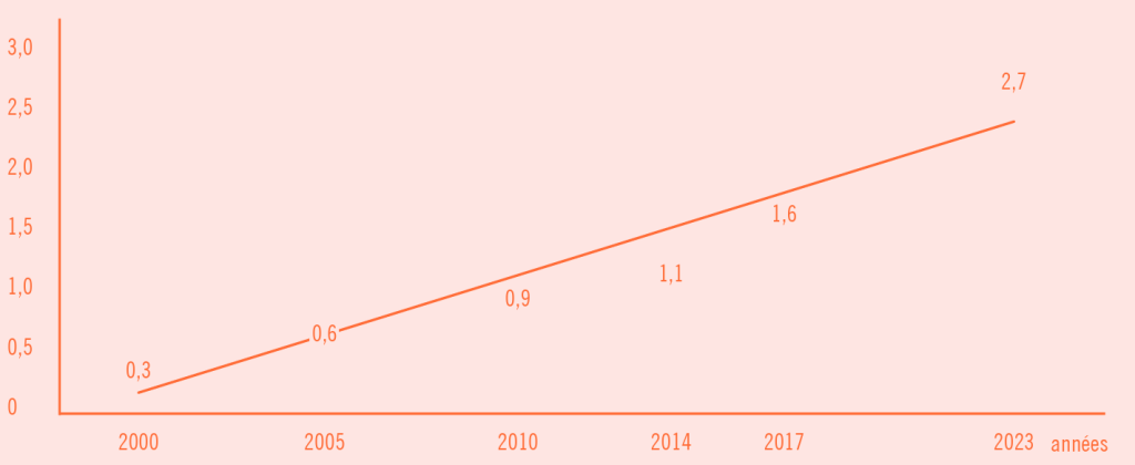 Jusqu’à quand la demande de cocaïne continuera-t-elle d’absorber cette offre phénoménale ? Nul ne le sait. Si le marché américain depuis des années est stagnant, voire en légère baisse, le marché mondial continue de se développer. Entre 2010 et 2022, selon l’ONUDC, le nombre de consommateurs dans l’année est passé de 16 millions à 23,5 millions2. Si les marchés africain et asiatique se développent, c’est le marché européen qui est le plus dynamique aujourd’hui. Selon l’European Drug Agency (EUDA), qui a succédé à l’EMCDDA, près de 3,4 millions d’usagers consommeraient de la cocaïne dans l’année. En France, la consommation a été multipliée par 9 en vingt ans et la hausse ne cesse de s’accélérer. Entre 2017 et 2023, les usages dans l’année ont crû de près de 70 % pour atteindre 2,7 % des 18-64 ans3, des proportions beaucoup plus élevées qu’aux États-Unis. Au vu de ces données, on peut penser que le marché de cocaïne est devenu le premier en euros, devant celui de cannabis dont les consommations sont stagnantes en France depuis dix ans.
