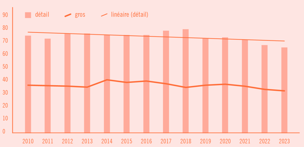 L’abondance de l’offre et la multiplication des acteurs qui se positionnent sur le marché de la cocaïne contribuent à la baisse du prix de la cocaïne au détail. En Colombie, le prix du kilogramme de la cocaïne pure se situe autour de 1 000 dollars, contre près de 1 700 dollars il y a vingt ans4, tandis qu’en bout de chaîne, au plus près du consommateur final, le prix de détail de la cocaïne diminue. Entre 2020 et 2023, le prix moyen de la cocaïne en euros constant est passé sur le marché français de 74 à 66 euros, tandis que le prix de gros pendant la même période passait de 37 500 à 32 500 euros le kilogramme. Force est de constater que les saisies énormes réalisées ces dernières années ne provoquent pas d’impact à la hausse des prix de gros et de détail.