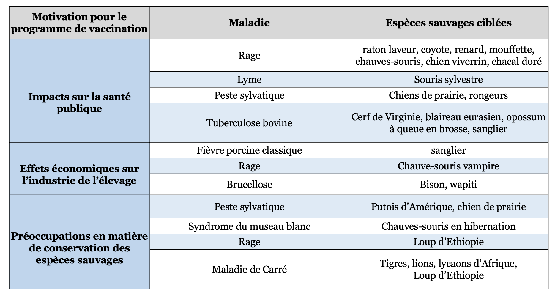 La vaccination de la faune sauvage reste marginale mais stratégique. L’exemple de la rage, éradiquée en France grâce à la vaccination orale des renards, est emblématique. D’autres pathologies zoonotiques pourraient théoriquement faire l’objet de campagnes similaires (Tableau 3) (37). La mise en œuvre d’un programme de vaccination ciblant des populations d’animaux sauvages requiert en amont un important travail de recherche visant à identifier le candidat vaccin présentant le meilleur compromis entre innocuité et efficacité, à optimiser la formulation galénique de l’appât – les vaccins ne pouvant être pour des conditions pratiques que des vaccins oraux – afin d’en maximiser l’attractivité pour les animaux, et à définir une stratégie de distribution à la fois efficiente et économiquement soutenable. Les choix technologiques et opérationnels doivent intégrer les spécificités écologiques, éthologiques et spatiales de l’espèce cible. Il faut pouvoir identifier la cible la plus simple à atteindre, qui n’est pas forcément celle directement responsable de la transmission d’une infection à l’homme.