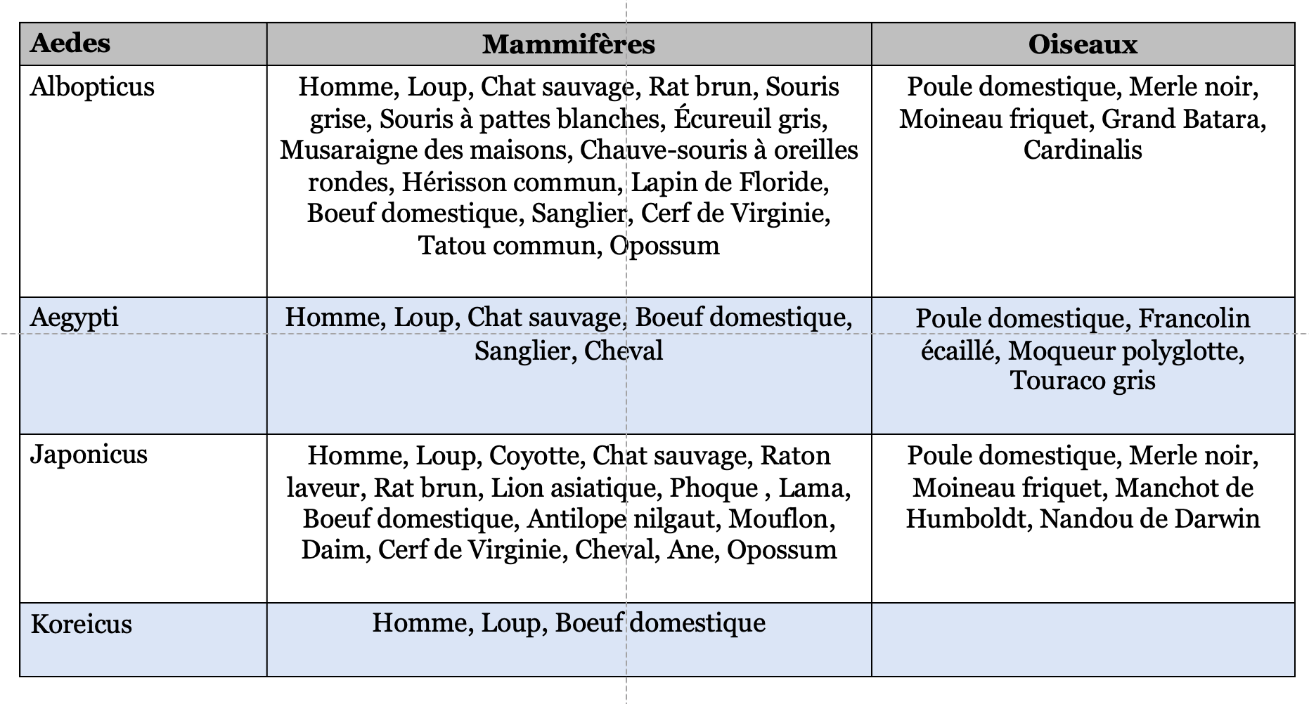 - Cebrián-Camisón S, Martínez-de la Puente J, et Figuerola J «A Literature Review of Host Feeding Patterns of Invasive Aedes Mosquitoes in Europe» Insects 2020 Nov 29;11(12):848. doi: 10.3390/insects11120848.