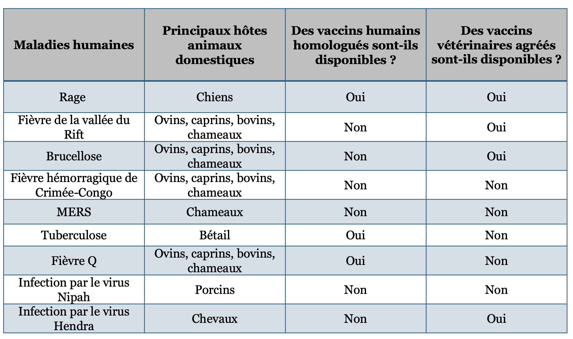 Plusieurs candidats vaccins ont été développés incluant des vaccins vivants atténués (VFVR clone 13, MP 12) ou inactivés (TSI-GSD-200) disponibles chez l’homme et l’animal mais avec des problèmes multiples : problèmes de tolérance, de difficultés de production, de non-différentiation infection/vaccination, et de risque de diffusion des souches vaccinales par les moustiques (VVA) (32). Parmi les nombreux autres candidats vaccins en cours de développement, le plus intéressant est celui reposant sur l’utilisation de la plateforme ChAdOX1 (désormais bien connue pour son utilisation pour un vaccin contre le Sars-CoV-2) exprimant les protéines Gn et Gc du virus. Ce vaccin, qui a pu montrer son efficacité dans la protection contre l’infection chez l’animal (mouton, bœuf, chèvre) (33), a été également testé dans un essai de phase 1 chez l’homme avec des résultats très satisfaisants en termes de tolérance et d’immunogénicité (34) ouvrant la perspective à un développement commun chez l’homme et l’animal. D’autres maladies pour lesquelles des programmes de vaccination inter-espèces sont envisageables ont été identifiées (35) (Tableau 2), certains envisageant même de cibler plusieurs virus ensemble, comme dans le cas du candidat vaccin contre le MERS basé sur l’utilisation d’un vecteur viral rabique (36).