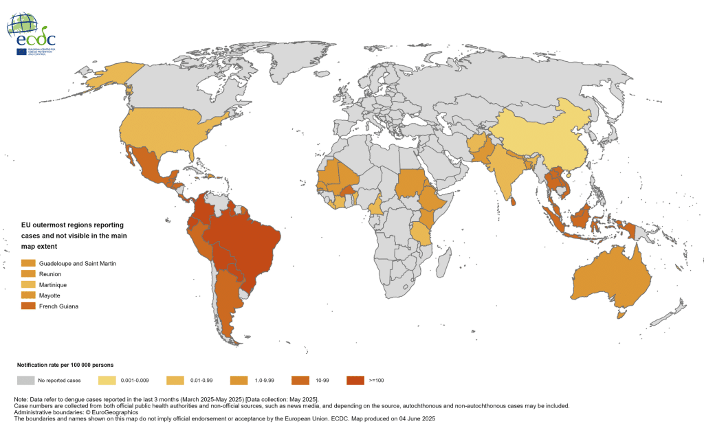 Après une année 2024 record (près de 8 millions de cas confirmés et plus de 11 000 morts dans 107 pays), plus de 3 millions de cas de dengue et plus de 1 400 décès liés à cette maladie ont été signalés dans 90 pays entre janvier et juin 2025. En Europe continentale, aucun cas autochtone n’a encore été rapporté en 2025. Cependant, des cas ont été signalés dans les régions ultrapériphériques de l’UE 5 (Départements français d’Outre-mer, Canaries, Açores et Madère).