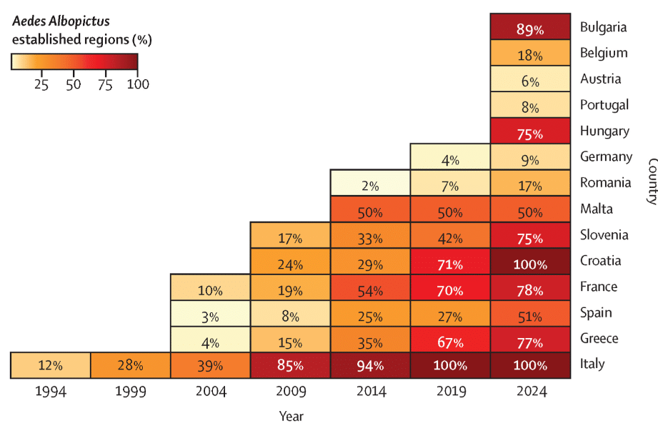 Observé pour la première fois en Albanie en 1979, en Italie en 1990 et en France en 1999 (avec un premier foyer en 2004), le moustique tigre s’est établi en 2024 dans de nombreux pays européens, à l’exception de ceux les plus au nord. En 2010, il avait colonisé 129 régions de 7 pays ; en 2022, 289 régions de 12 pays étaient touchées, puis 358 régions de 14 pays en 2024. Des chiffres qui témoignent de la rapidité avec laquelle Aedes albopictus est capable d’envahir l’Europe.