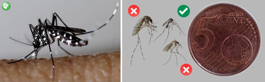 Il se caractérise par ses pattes postérieures noires avec cinq anneaux d’écailles blanches, et la présence d’une ligne médiane composée d’écailles blanches sur la partie dorsale de son thorax (le scutum). Par conséquent, les moustiques qui ont plusieurs lignes d’écailles sur le scutum ou qui présentent d’autres motifs de couleur brune ou dorée ne sont pas des moustiques tigres.