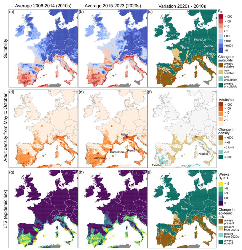 Effet simulé des conditions climatiques récentes sur l’adaptabilité d’Ae. albopictus (rangée supérieure), la densité des adultes pendant la période d’activité (rangée centrale) et le risque de transmission de la dengue (rangée inférieure) en Europe occidentale. (a) Zones propices, mesurées à l’aide de E0 en 2006-2014, (b) en 2015-2023 et (c) variation entre les deux périodes (en tenant compte du seuil E0 > 1). (d) Abondance moyenne des adultes (par ha) entre mai et octobre pour la période 2006-2014, (b) 2015-2023, (c) et variation. (g) LTS pour la dengue (nombre de jours où R0 > 1) pour 2006-2014, (h) 2015-2023 (i) et variation. Les lignes de la carte délimitent les zones d’étude et ne représentent pas nécessairement les frontières nationales reconnues.