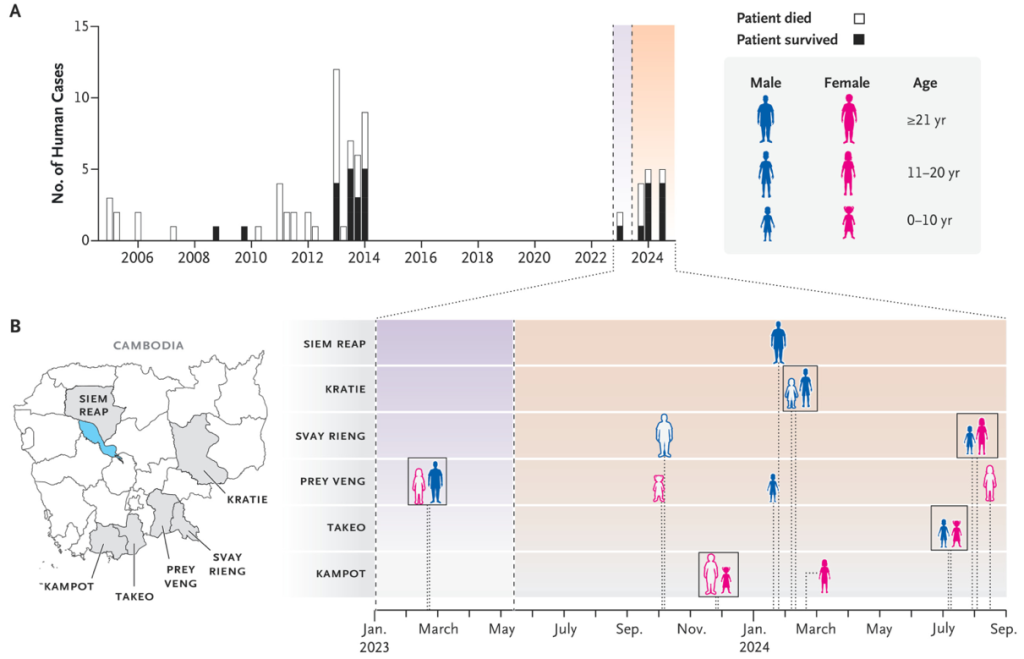Cas humains de grippe aviaire hautement pathogène au Cambodge en 2023-2024. Le panneau A présente l’évolution trimestrielle du nombre de cas humains depuis 2005. Le panneau B détaille les foyers épidémiques par province de février 2023 à août 2024. Les silhouettes représentent l’âge, le sexe et l’évolution clinique de chaque patient. Les cas dus au virus historique 2.3.2.1e sont représentés en violet, et les cas de réassortiment viral en orange. Source Siegers JY, et al. (2025) http://doi.org/10.1056/NEJMc2504302