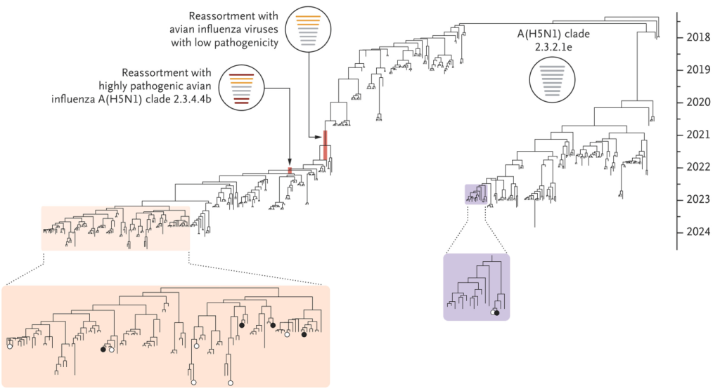 Dans un article publié dans le New England Journal of Medicine le 22 octobre 2025, des chercheurs, parmi lesquels Eric Karlsson (Institut Pasteur du Cambodge à Phnom Penh), indiquent que les premiers cas, survenus en février 2023, étaient dus au clade A (H5N1) 2.3.2.1e, endémique dans la région (anciennement classé 2.3.2.1c selon la nomenclature de l’OMS), tandis que les cas ultérieurs étaient associés à un nouveau virus réassortant. Le clade local 2.3.2.1e a acquis des gènes du clade 2.3.4.4b et de plusieurs virus de la grippe aviaire faiblement pathogènes, probablement par transmission via des oiseaux sauvages ou des volailles non détectées ; le manque de données génomiques ne permet cependant pas d’attribuer la source avec certitude. Ce virus réassortant s’est propagé dans la sous-région du Grand Mékong (qui couvre tous les pays du Yunnan en Chine, Thaïlande, Birmanie, Laos, Cambodge, Vietnam), remplaçant les souches précédentes. Il est à noter que ce virus porte des signatures génomiques (par exemple, PB2:E627K) associées à une activité polymérase, une virulence et une capacité de réplication accrues chez les oiseaux et les mammifères, ce qui représente un risque plus important en matière de transmission zoonotique et pour la filière avicole.
