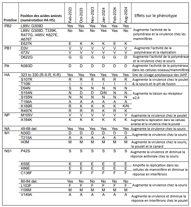 - Les protéines HA présentent des substitutions N158D et T160A, associées à une transmissibilité accrue chez les mammifères ;