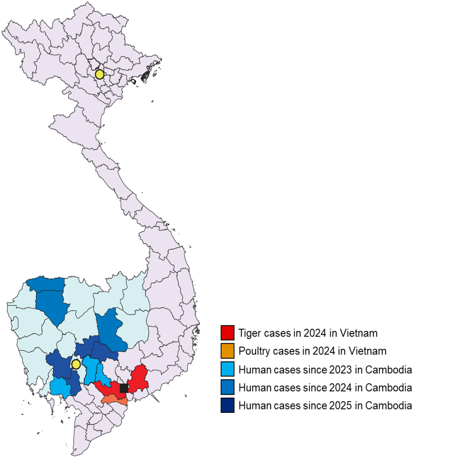 Carte des provinces vietnamiennes et cambodgiennes où des cas d’infection par le sous-type H5N1 du clade 2.3.2.1e du virus de la grippe aviaire hautement pathogène ont été identifiés. Les provinces du Vietnam et du Cambodge sont représentées respectivement en violet clair et en bleu clair. Les cercles jaunes représentent les capitales du Vietnam et du Cambodge ; le carré noir représente Hô Chi Minh-Ville. Source : Amano, M., et al. (2025). https://doi.org/10.1080/22221751.2025.2582252