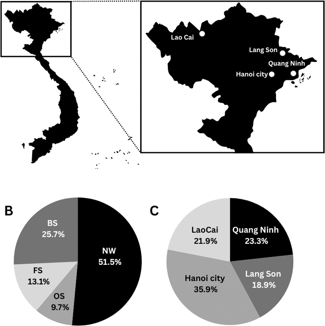 Carte du Vietnam montrant la localisation des marchés aux oiseaux et volailles vivantes étudiés (panneau A) et la répartition des échantillons prélevés par type (panneau B) et lieu de prélèvement (panneau C). Lavages nasaux humains (NW), écouvillons oropharyngés d’oiseaux et volailles (OS), écouvillons fécaux de cages (FS) et échantillons de bioaérosols (BS). Les proportions indiquées dans les panneaux B et C se rapportent aux 688 échantillons analysés au total à l’University of Texas Medical Branch. Source : Bui, Vuong N. et al. (2025) https://doi.org/10.1016/j.ijid.2025.108132