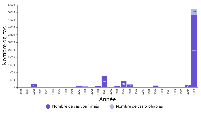 Cette flambée place l’année 2025 comme un point de rupture : alors que la moyenne annuelle depuis 1998 tournait autour de 91 cas par an, les niveaux actuels sont plus de 50 fois supérieurs aux moyennes historiques.