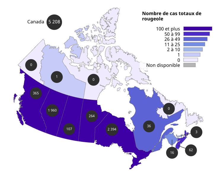 Fig.2 : Distribution géographique du nombre total de cas de rougeole par province ou territoire en 2025. Source : sante-infobase Canada https://sante-infobase.canada.ca/rougeole-rubeole/#a21