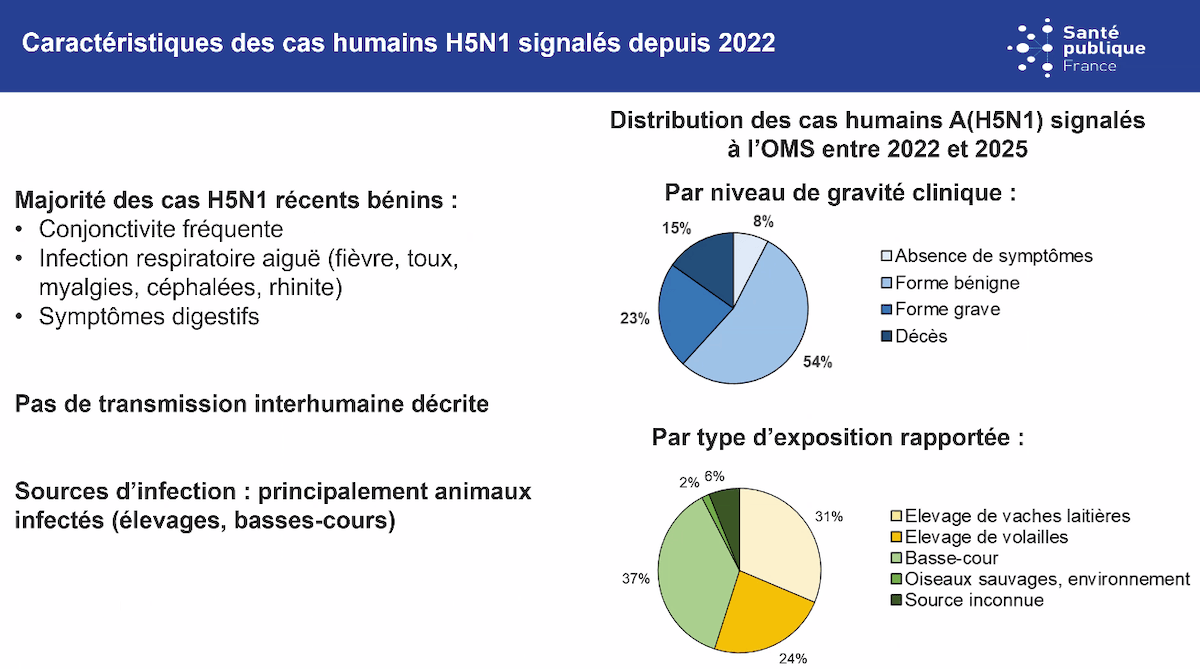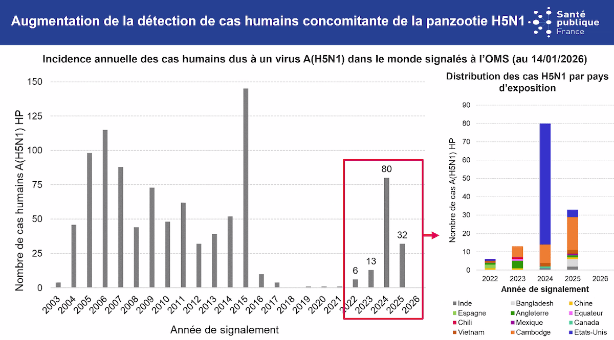 Parallèlement à cette panzootie observée depuis 2021, une recrudescence préoccupante de cas humains de H5N1 a été enregistrée au niveau international. Les premiers ont été détectés en 1997, mais le nombre le plus important a été détecté, pour l’instant, entre 2003 et 2015. Après une accalmie entre 2016 et 2021, le nombre de cas détectés est reparti à la hausse depuis l’émergence du clade 2.3.4.4b. Entre 2022 et 2025 (pas de cas encore rapporté en 2026), plus d’une centaine de cas ont été signalés à l’OMS, avec une diversification géographique remarquable : Europe (principalement Royaume-Uni), Amériques (États-Unis, Canada, Mexique, Équateur, Chili) et Asie (Cambodge, Vietnam, Inde, Bangladesh).