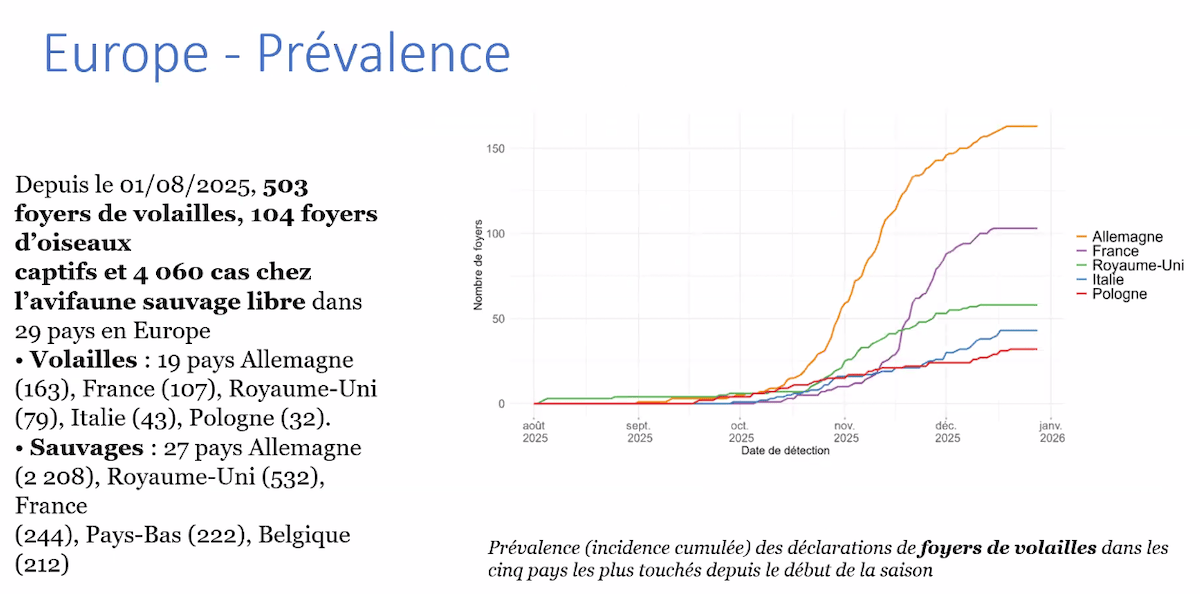 Le 1er août 2025 marque le début de la saison de surveillance alignée sur les migrations aviaires. Depuis cette date, l’Europe a recensé 503 foyers en élevages de volailles, 104 foyers touchant des oiseaux captifs et 4 060 cas chez les oiseaux sauvages dans 29 pays. L’Allemagne apparaît comme le pays le plus touché avec 163 foyers en élevage et plus de 2 200 cas chez les oiseaux sauvages, suivie par le Royaume-Uni (79 foyers en élevage, 2 200 cas en faune sauvage) et la France (107 foyers en élevage, 244 cas chez les oiseaux sauvages).