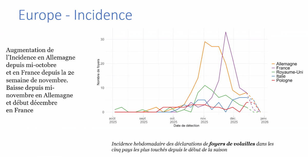 Cette saison se caractérise par une précocité inhabituelle. L’augmentation de l’incidence a débuté dès mi-octobre en Allemagne, suivie début novembre en France, avant une décrue notable à partir de mi-novembre en Allemagne et mi-décembre en France. Cette dynamique a coïncidé avec un épisode de mortalité massive touchant particulièrement les grues cendrées lors de leur migration descendante, avec plus de 10 000 mortalités recensées, principalement en Allemagne et dans le nord-est de la France. D’autres espèces ont également été affectées –anatidés, rapaces– mais les grues restent les plus impactées, comme cela avait déjà été observé en Israël en 2022 et 2021.