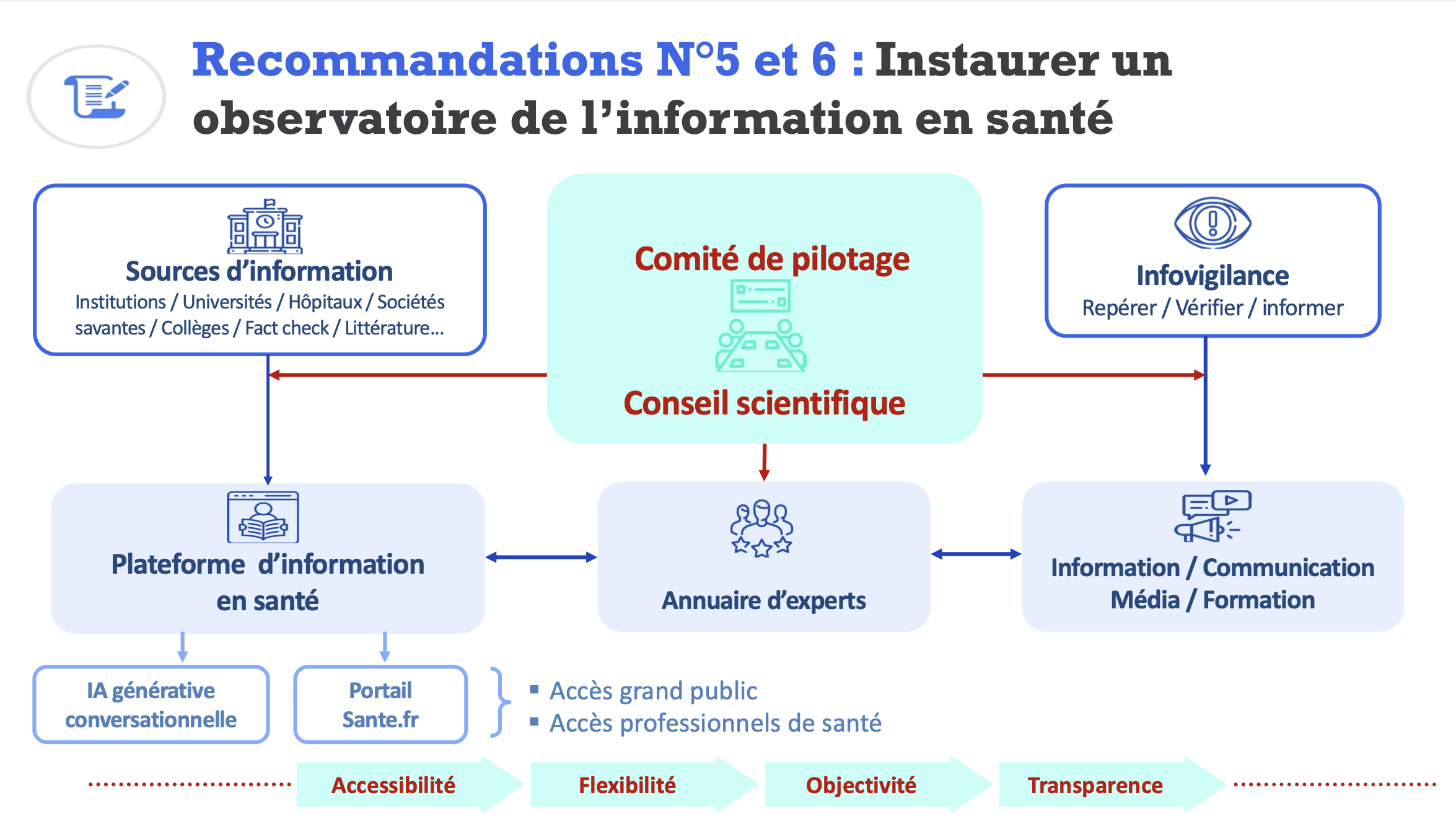 - Créer un observatoire de l’information en santé qui deviendrait le point d’entrée public de l’information de santé fiable en France. Coordonné par un comité de pilotage s’appuyant sur un conseil scientifique, il serait doté d’une plateforme d’information accessible via le portail Santé.fr modernisé, d’une IA générative conversationnelle, d’un annuaire d’experts et d’un système d’infovigilance pour signaler les nouveaux cas de désinformation en santé.