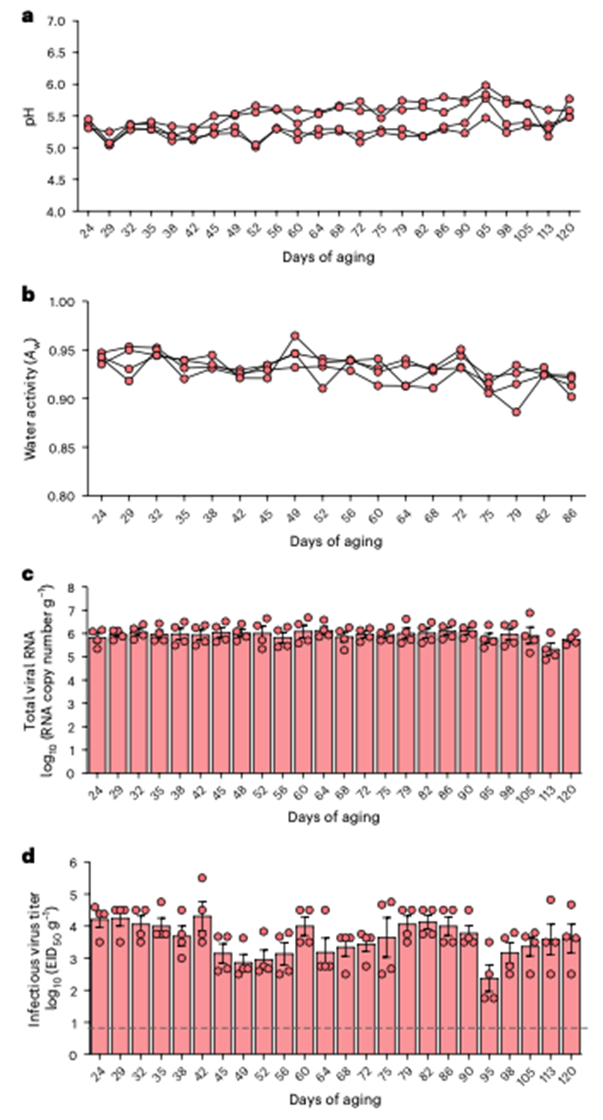 a,b, Évolution du pH (a) et de l’activité de l’eau (b) dans des échantillons de fromages au lait cru commercialisés pendant la période d’affinage de 60 jours. c, Charges virales d’ARN du virus H5N1 dans des échantillons de fromages au lait cru commercialisés entre le 24e jour (jour de réception des échantillons) et le 120e jour d’affinage, déterminées par rRT-PCR (n = 4). d, Charges virales infectieuses H5N1 dans des échantillons de fromages au lait cru commercialisés du jour 24 au jour 120 d’affinage, déterminées par titrage viral dans des ECE (n = 4). Les données sont présentées sous forme de lectures individuelles des échantillons de fromage (a-d) et sous forme de moyenne ± erreur standard (c et d) de quatre (n = 4) échantillons de fromage au lait cru commercialisés.