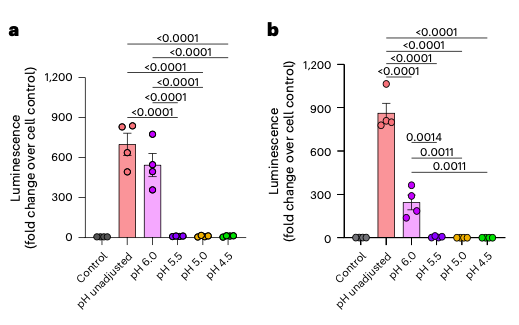 a,b, Du lait cru normal (a) ou une solution saline tamponnée au phosphate (PBS) (b) enrichis en virus (HPAI) H5N1 rTX2/24-NLuc ont été acidifiés à un pH de 6,0, 5,5, 5,0 et 4,5, puis incubé à 4 °C pendant 1 heure. Des cellules épithéliales utérines bovines (Cal-1) ont été inoculées avec 0,2 ml d’échantillons de lait ou de PBS (à chaque niveau de pH) et incubées à 4 °C pendant 1 heure (adsorption du virus), puis transférées et incubées à 37 °C pendant 4 heures. Les lysats cellulaires ont été recueillis et l’activité luciférase a été mesurée à l’aide d’un luminomètre. Les données représentent les observations (points) de quatre réplicats (n = 4) superposées à la moyenne (ligne horizontale) et ± erreur standard de quatre expériences indépendantes.