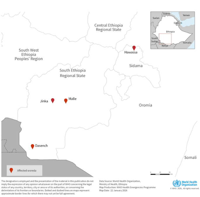 Le premier cas connu avait développé des symptômes fin octobre : vomissements, perte d’appétit, douleurs abdominales, puis aggravation rapide de l’état général. Au fil des semaines, d’autres cas ont été identifiés dans plusieurs districts de la région Sud et jusqu’à Hawassa, dans la région de Sidama.