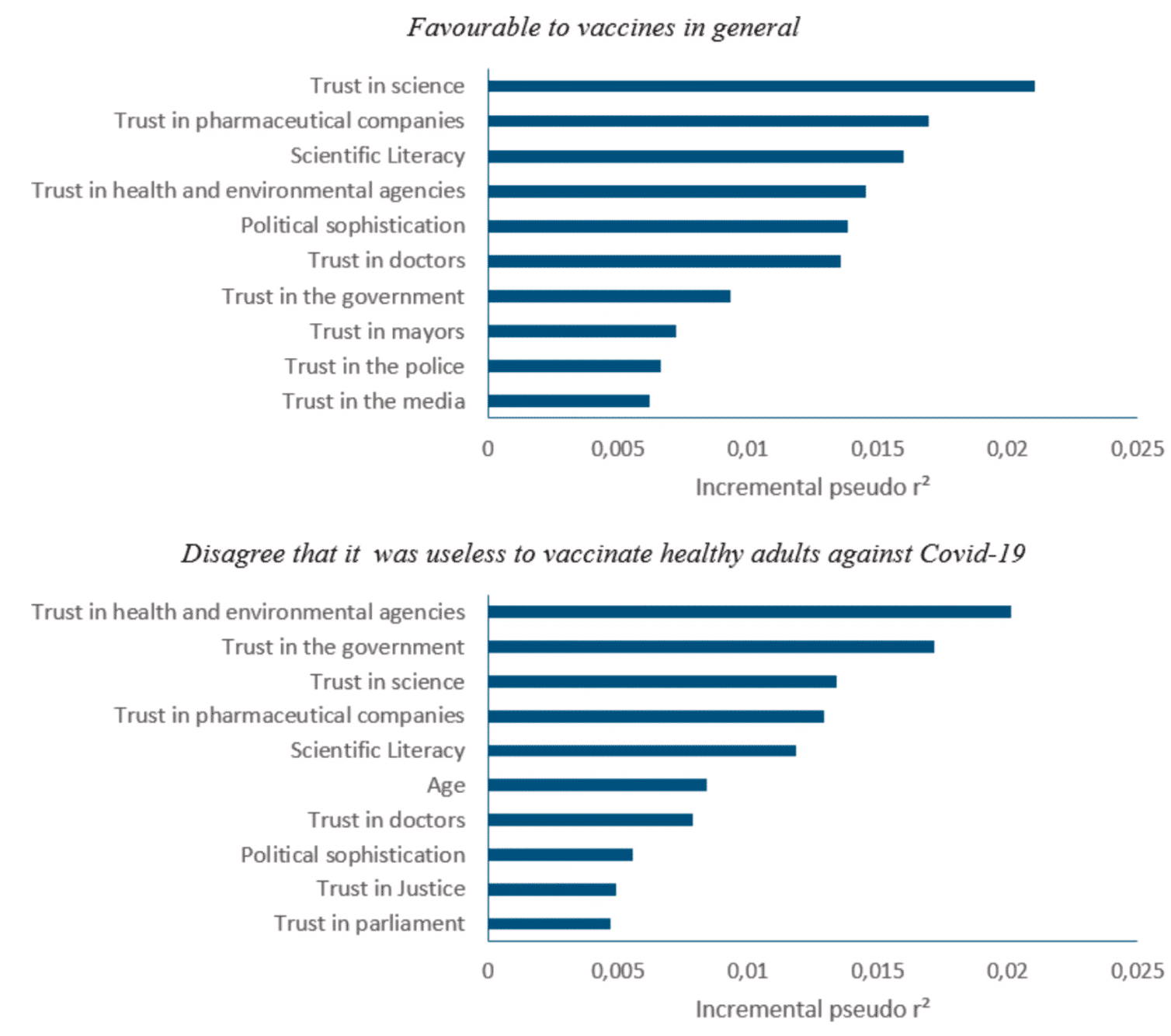 Sur la base de l’analyse statistique classique descriptive uni et multivariée, une analyse dite «de dominance», elle aussi classique en sciences sociales quantitatives, sélectionne et classe les déterminants les plus associés à «chaque» vaccination et leur association avec le niveau de confiance pour les diverses institutions en y ajoutant la littératie en santé et la «sophistication politique» décrite plus haut.