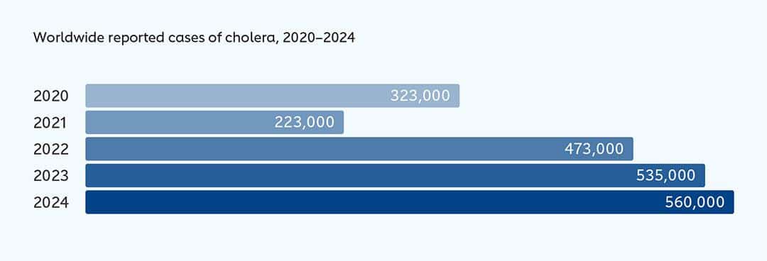 Le choléra illustre cette dynamique: plus de 6000 personnes en sont mortes en 2024, soit environ 50% de plus qu’en 2023, et le nombre de pays touchés est passé de 45 à 60. La situation a été aggravée par les perturbations de la surveillance épidémiologique dans des zones de conflit comme le Soudan et la République démocratique du Congo. En réponse, la production mondiale de vaccin oral contre le choléra est passée d’environ 30 millions de doses en 2022 à 80 millions en 2025.