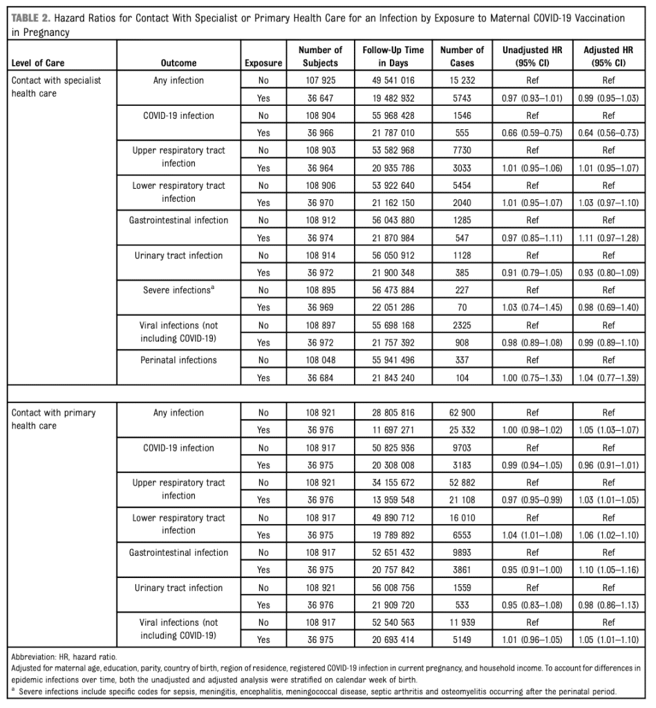 En soins primaires, une légère augmentation du risque d’infections est initialement observée chez les enfants exposés (HRa 1,05; 95% CI, 1.03–1.05). Mais cette association disparaît après exclusion des enfants de mères non vaccinées en fin de suivi, dont la majorité n’étaient pas nés en Norvège et pour lesquels il manquait des données en matière d’éducation et de revenus. Les auteurs de l’étude expliquent la disparition de ce lien par un recours aux soins primaires différent dans ce groupe.