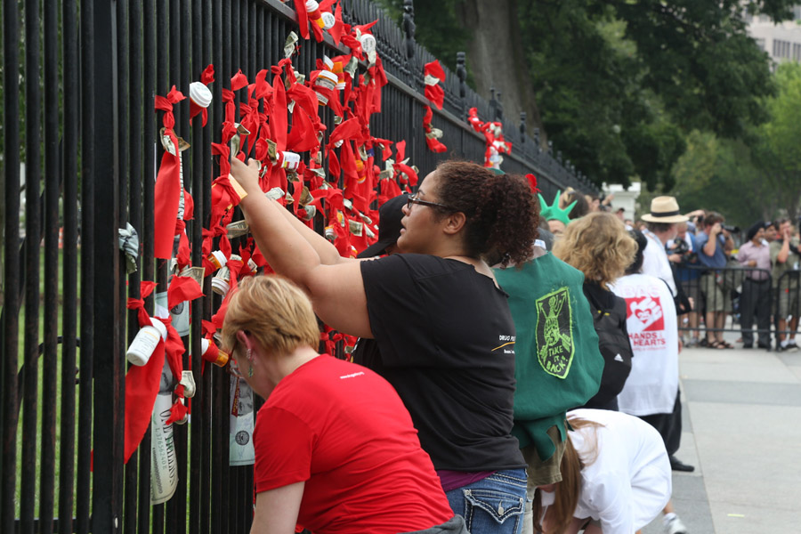 Les activistes, avant de se faire arrêter, ont noué des rubans rouges sur les grilles de la Maison blanche.