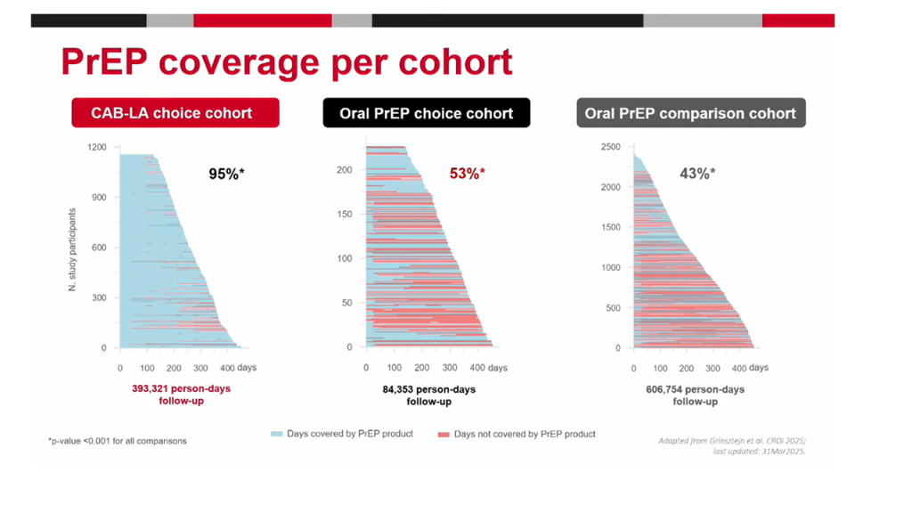 Des résultats cohérents avec ceux observés au Brésil, où une étude menée par Beatriz Grinsztejn (Fondation Oswaldo Cruz) auprès de 3 865 adultes SGM HIV-négatives (SGM = Sexual and Gender Minorities), montre que 51 % des minorités sexuelles et de genre HIV-négatives de plus de 18 ans attendent la PrEP semestrielle, et 17 % la version bimestrielle. Dans une étude comparative, baptisée ImPrEP comprenant une cohorte historique de PrEP orale, une cohorte prospective de PrEP orale et une cohorte prospective de PrEP par cabotégravir, l’observance vis-à-vis de la PrEP injectable atteint 94 %, ce qui est loin devant celle observée dans la cohorte prospective de PrEP orale ou la cohorte de référence, respectivement à 53% et 43% d’observance.