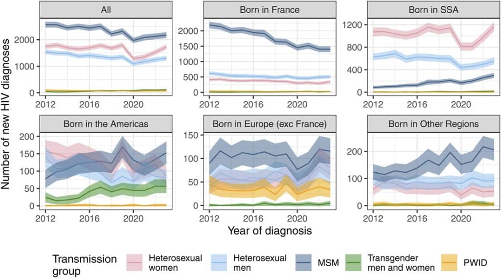 Figure 1 – Nouveaux diagnostics de VIH en France de 2012 à 2023 selon le lieu de naissance et le groupe de transmission. Source : HIV Incidence, Migration and Diagnosis Dynamics, France, 2012–2023: A Surveillance and Modeling Data Analysis, JAIDS Journal of Acquired Immune Deficiency Syndromes100(3):217-223, November 1, 2025.