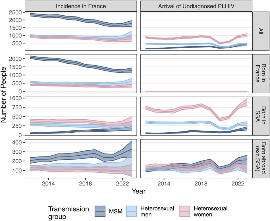 Figure 2 – Nouvelles infections à VIH et arrivées de personnes vivant avec le VIH non diagnostiquées en France, 2012-2023, par pays de naissance et groupe de transmission. Source : HIV Incidence, Migration and Diagnosis Dynamics, France, 2012–2023: A Surveillance and Modeling Data Analysis, JAIDS Journal of Acquired Immune Deficiency Syndromes100(3):217-223, November 1, 2025.