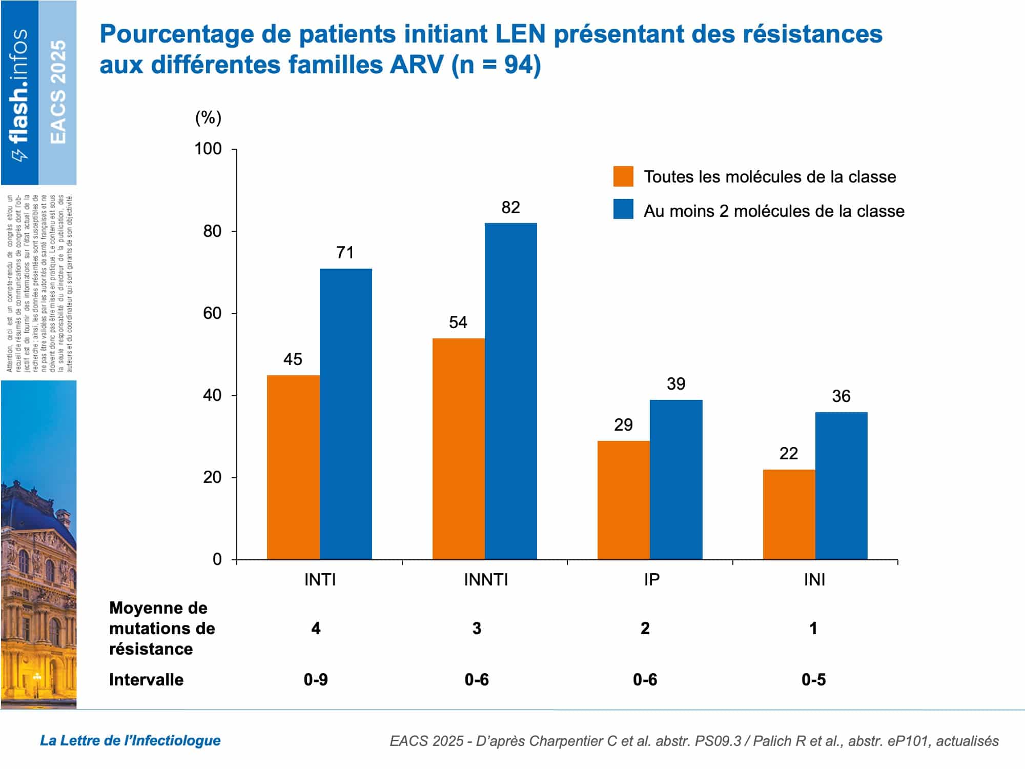 Au total, 94 PVVIHPVVIH Personne vivant avec le VIH ont été incluses dans l’analyse, dont 49 (52 %) étaient en suppression virologique au moment de l’initiation du LEN et du traitement ARV associé. En miroir, 45 (48 %) avaient une CV détectable, avec une CV médiane à 2,5 log10 copies/mL. Les participants étaient porteurs de virus présentant une résistance cumulée à de nombreux ARV, dans plusieurs classes thérapeutiques, limitant les options thérapeutiques (figure 1). La durée médiane de suivi sous LEN était de 14 mois. Le score de sensibilité génotypique (genotypic susceptibility score, GSS) des ARV associés au LEN était inférieur à 1 chez 51 participants (65 %). 12 participants (13 %) ont interrompu le traitement à base de LEN : 3 étant perdus de vue, 4 en raison d’un échec virologique, 1 en raison d’effets indésirables cutanés, 1 sur décision du patient, et 3 en raison d’un décès sans lien avec le traitement. L’échec virologique tel que défini dans cette étude observationnelle est survenu chez 7 participants (7 %) : 3 qui étaient en succès virologique à l’initiation du LEN, et 4 déjà en échec au moment de l’initiation du LEN. Une absence de réponse virologique (CV médiane : 164 copies/mL) a été observée chez 12 participants (13 %), tous en échec virologique au moment du début du LEN. Une séquence de la capside au moment de l’échec était disponible pour 8 participants, révélant l’émergence de la mutation N74D chez un seul d’entre eux. Aucune mutation de résistance émergente n’a été observée pour les autres ARV du traitement de fond, à l’exception d’un passage vers un tropisme X4 chez une personne recevant du maraviroc. Les concentrations plasmatiques de LEN étaient disponibles pour 11 des 19 personnes en échec virologique, avec des taux considérés comme adéquats (> 15 ng/mL) dans 27/35 (68 %) échantillons analysés.