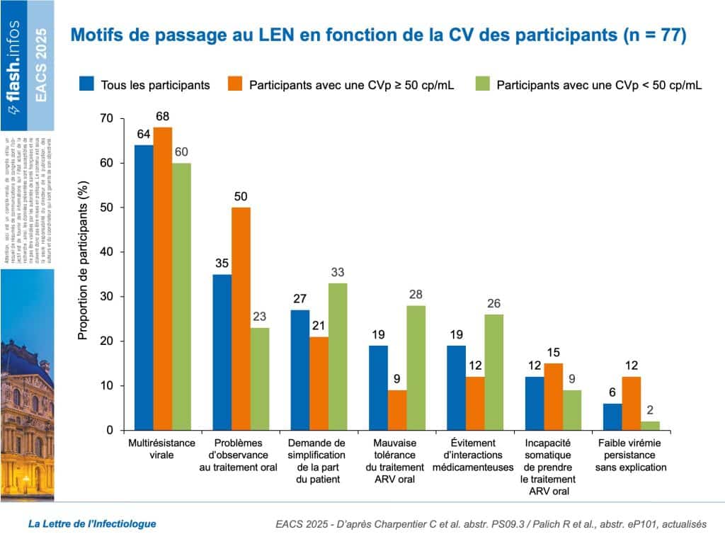 En conclusion, ces deux études françaises montrent que les PVVIH recevant du LEN depuis sa commercialisation présentent un profil distinct de celui des participants des essais cliniques pivots, incluant de nombreuses personnes en succès virologique bénéficiant, pour certaines d’entre elles, d’un traitement “tout injectable” par l’association du LEN avec le cabotégravir et/ou la rilpivirine injectable.