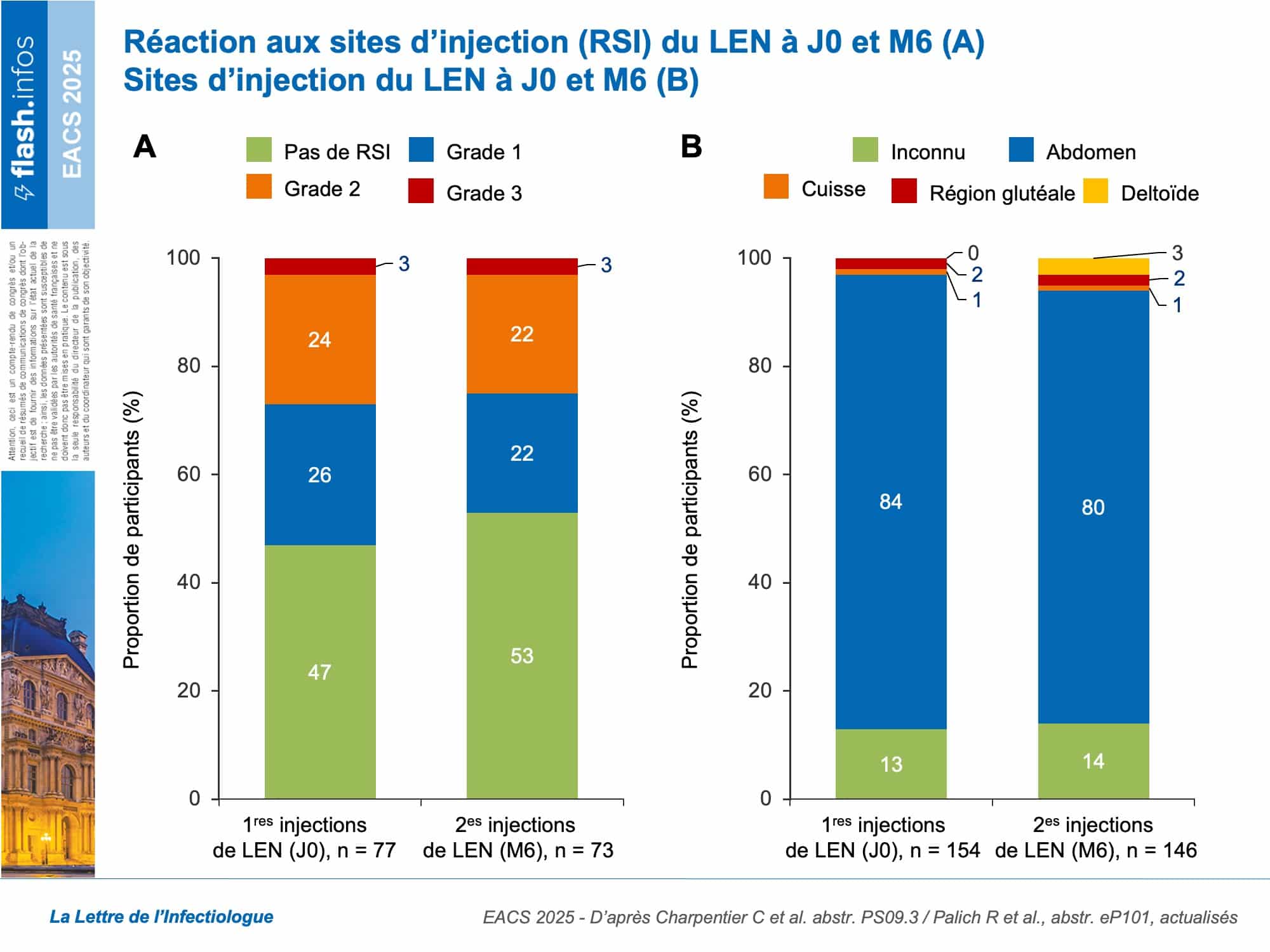 Une autre étude, conduite auprès d’une population d’étude sensiblement identique, permet de connaître les caractéristiques cliniques des PVVIH recevant du LEN durant cette période. Cette deuxième analyse portait sur 77 participants, présentant de nombreux facteurs de vulnérabilité et des difficultés d’observance (tableau). Les principales raisons mentionnées pour passer à un traitement par LEN (en association à d’autres ARV) étaient la multirésistance virale (64 %), les difficultés d’observance (35 %), une demande de simplification du traitement ARV demandée par le patient (27 %), une mauvaise tolérance du traitement ARV oral (20 %) et l’éviction d’interactions médicamenteuses (20 %) (figure 2). Des réactions au site d’injection (RSI) ont été rapportées chez 41/77 participants (53 %) au moment des premières injections (J0) et chez 34/73 (47 %) au moment des deuxièmes injections (M6). 96 % (129/134) des injections à J0 et 93 % (117/126) des injections à M6 ont été administrées dans l’abdomen (figure 3). À M6, les injections ont été effectuées “dans les temps” pour 81 % des participants, en avance pour 15 %, et en retard pour 4,1 %.