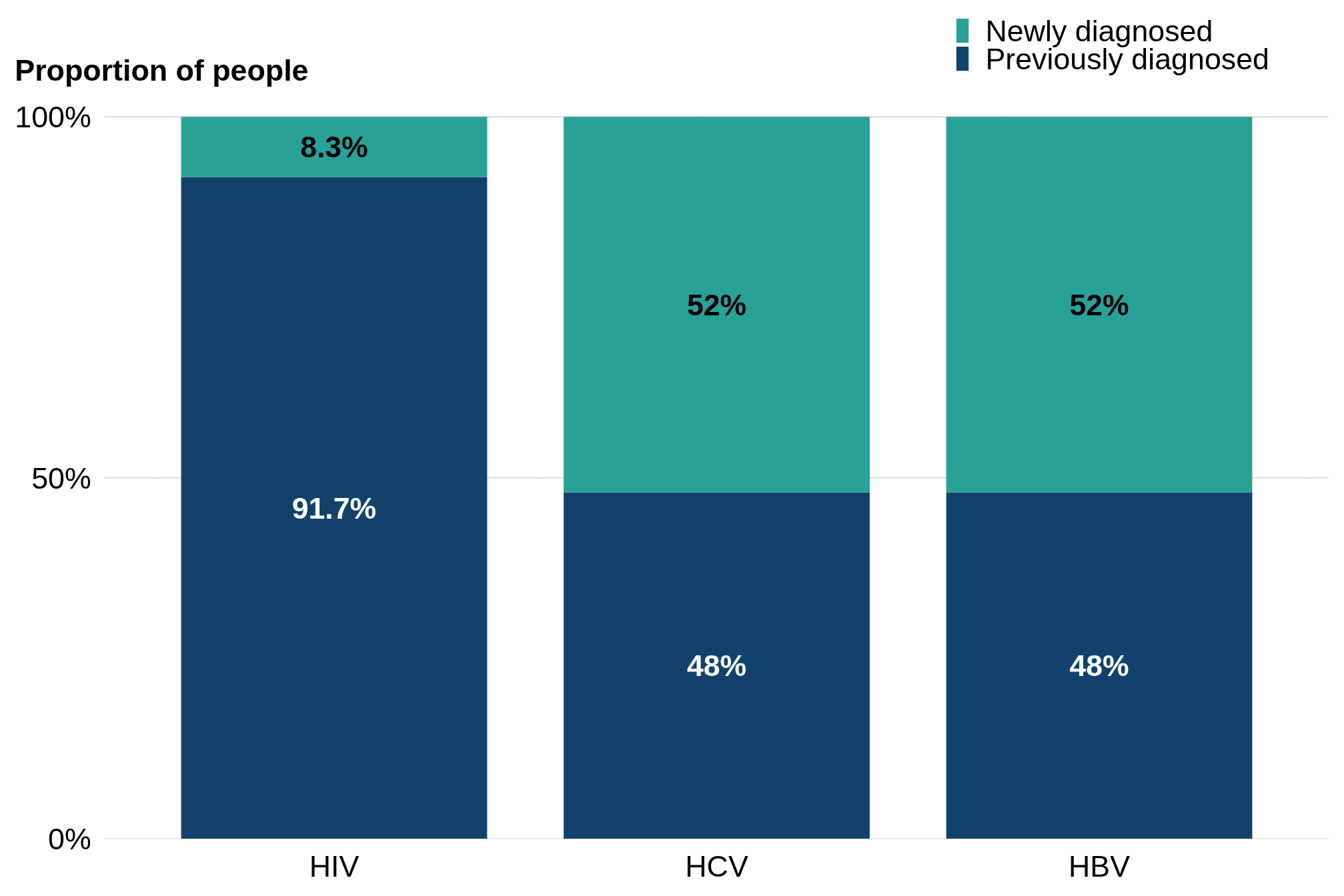 Figure 1. Proportion de résultats positifs aux tests correspondant à de nouveaux diagnostics ou à des personnes déjà diagnostiquées, selon le type de virus sanguin. Source: SSBBV data for 24 sites, matched to HANDD or HARS.