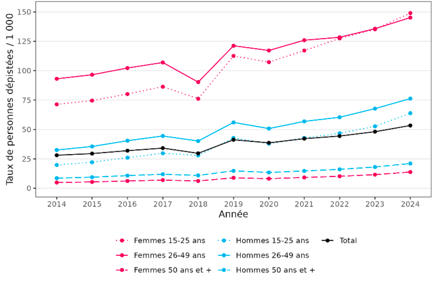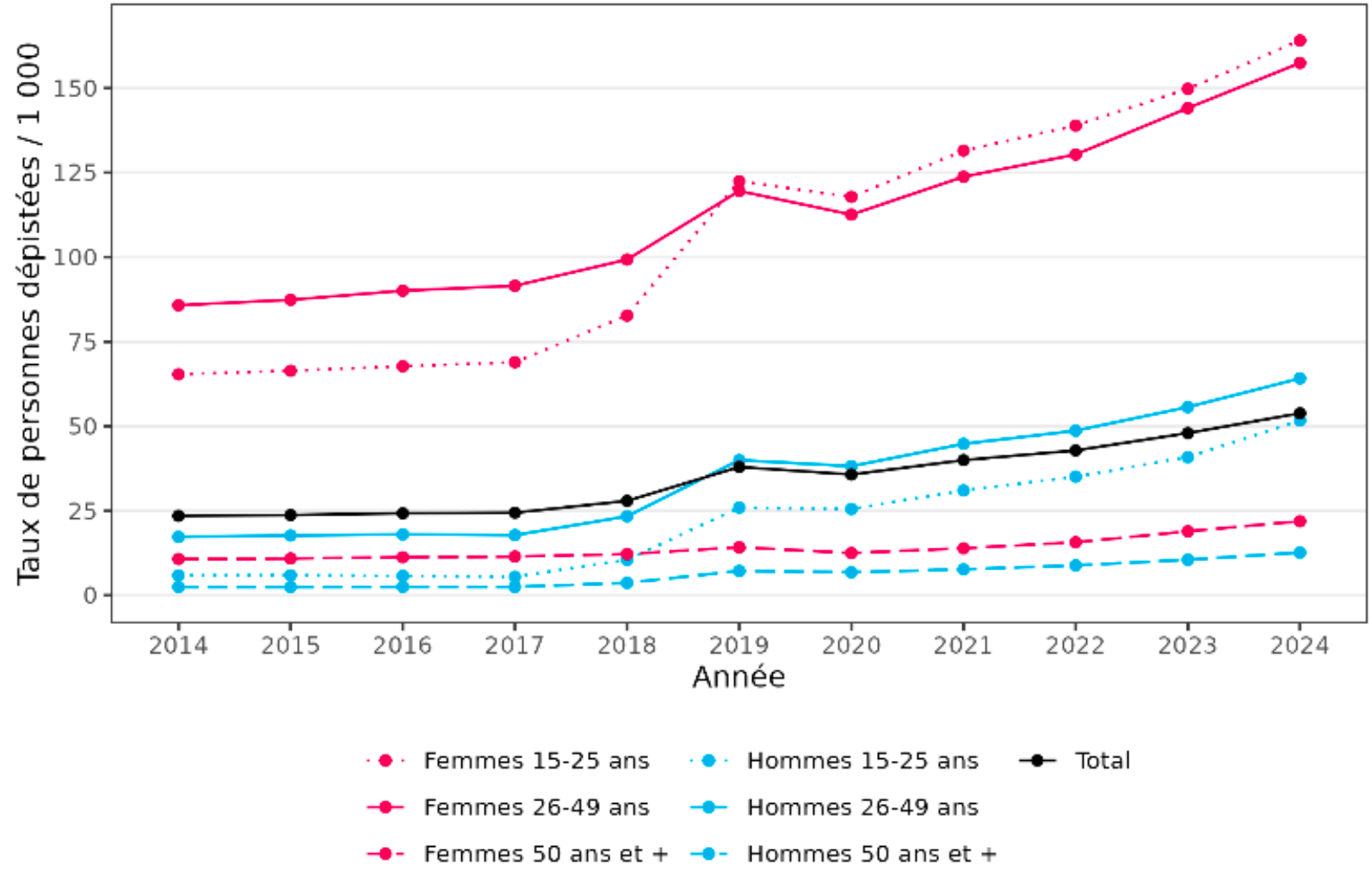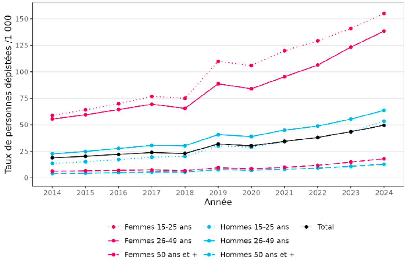 Globalement, ce sont 3,4 millions de personnes qui ont fait un dépistage chlamydia en 2024, 3,7 millions pour le gonocoque et autant pour la syphilis. Les taux de dépistage en population sont en augmentation régulière dans les deux sexes : si le rythme d’accroissement du dépistage est plus accentué chez les hommes, les femmes qui avaient un temps d’avance recourent plus au dépistage. « Mon test IST » encore très récent (septembre 2024) est plus utilisé par les femmes que par les hommes.