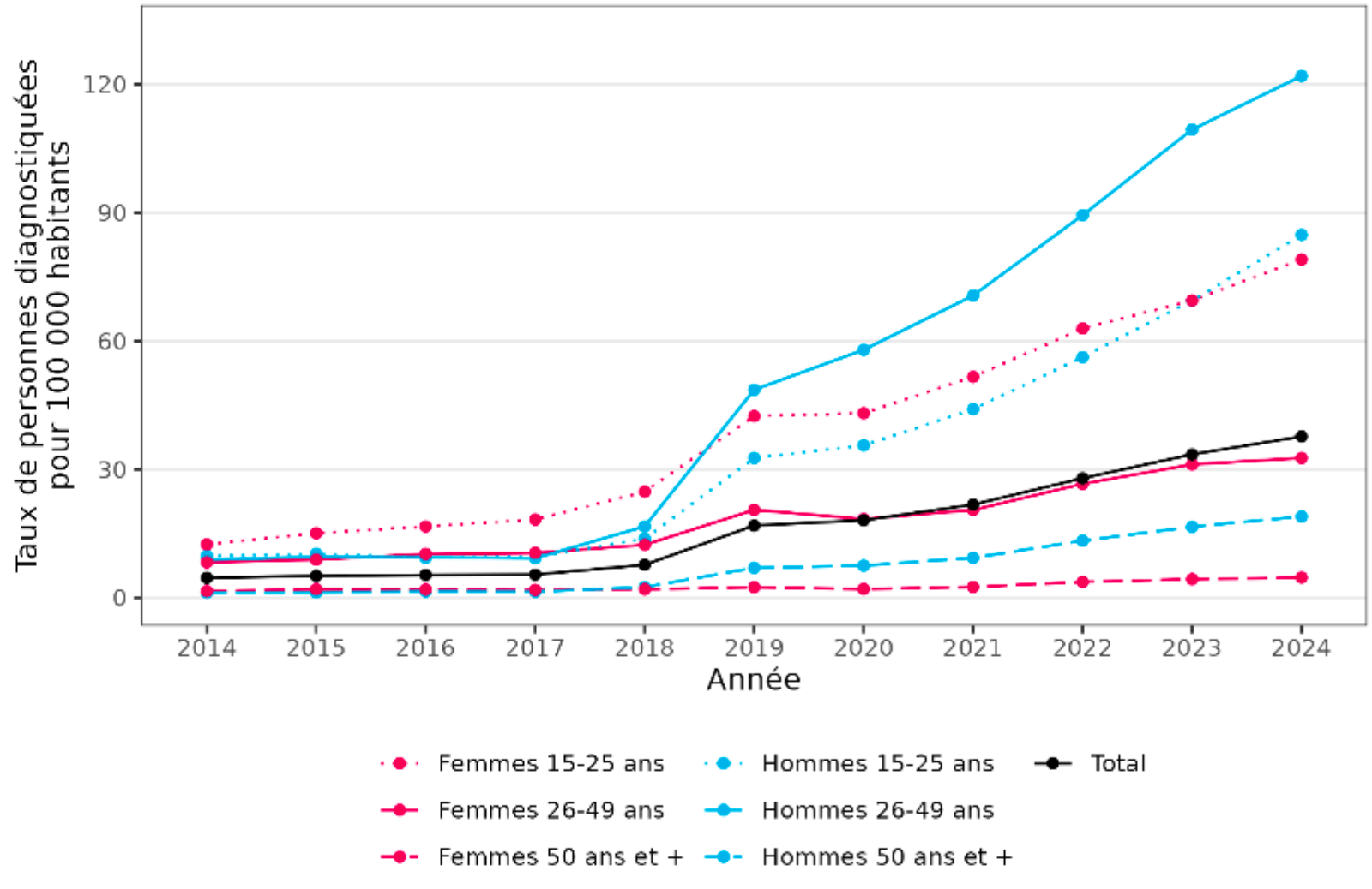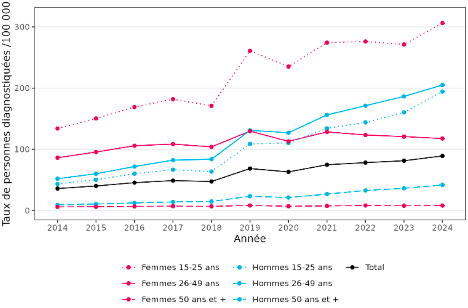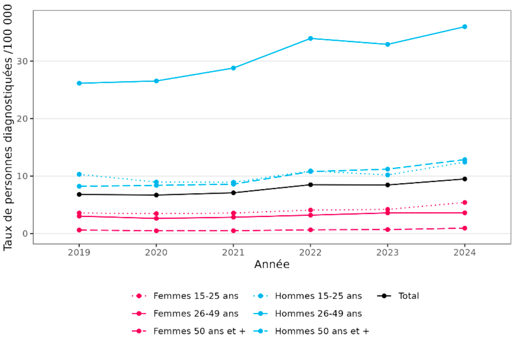 Logiquement, l’augmentation du dépistage se traduit dans l’augmentation des taux de diagnostics dans les deux sexes. En 2024, les taux d’infection diagnostiquée et traitée sont de 104 pour 100 000 chez les hommes et 75 chez les femmes pour chlamydia, l’écart est plus marqué pour les infections à gonocoque traitées, respectivement 55 et 21 pour 100000, et plus encore pour la syphilis avec 17 pour 100000 chez les hommes et 2 chez les femmes. En termes d’âge, pour les infections à chlamydia, les jeunes femmes (moins de 25 ans) sont le groupe le plus touché devant les hommes de 25 à 49 ans, pour les infections à gonocoque, les hommes de 25 à 49 ans sont très au-dessus des <25 ans, hommes et femmes, pour la syphilis, les hommes de 25 à 49 ans un taux très au-dessus des autres groupes masculins, les femmes ont des taux quel que soit l’âge en dessous de tous les groupes masculins.