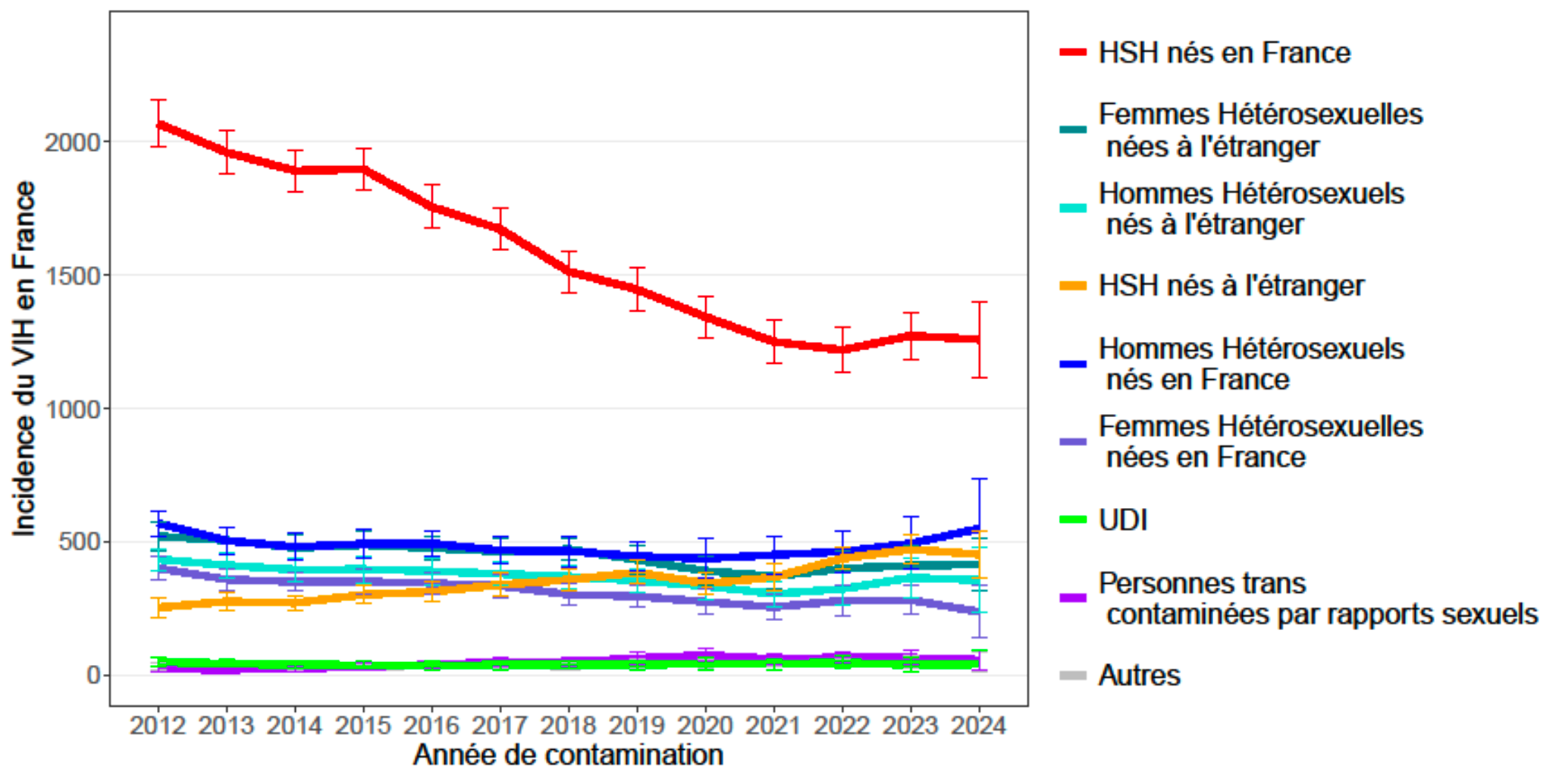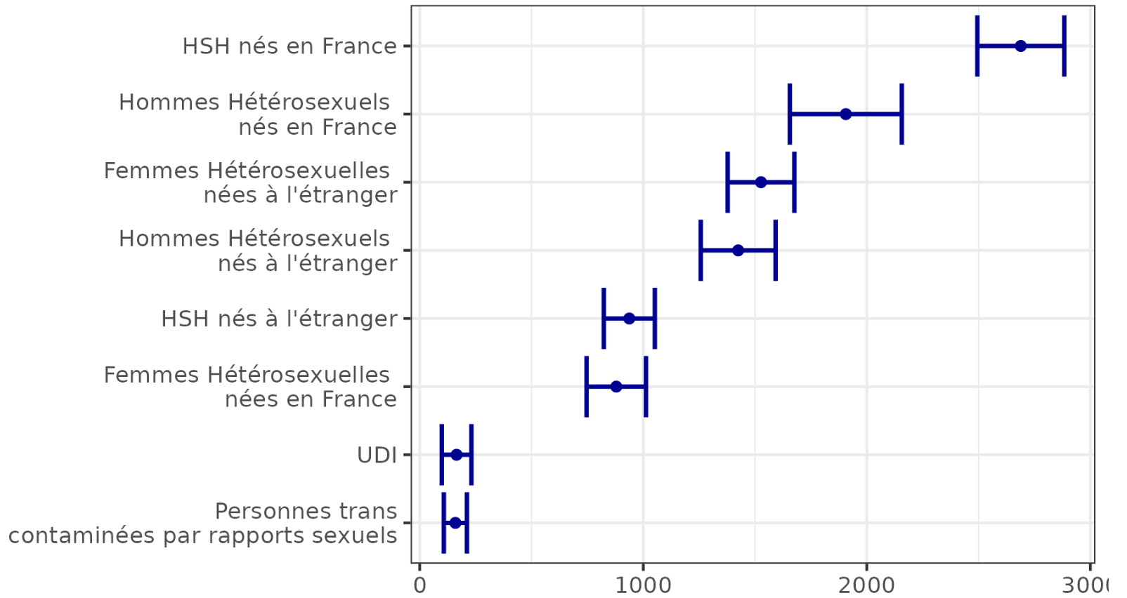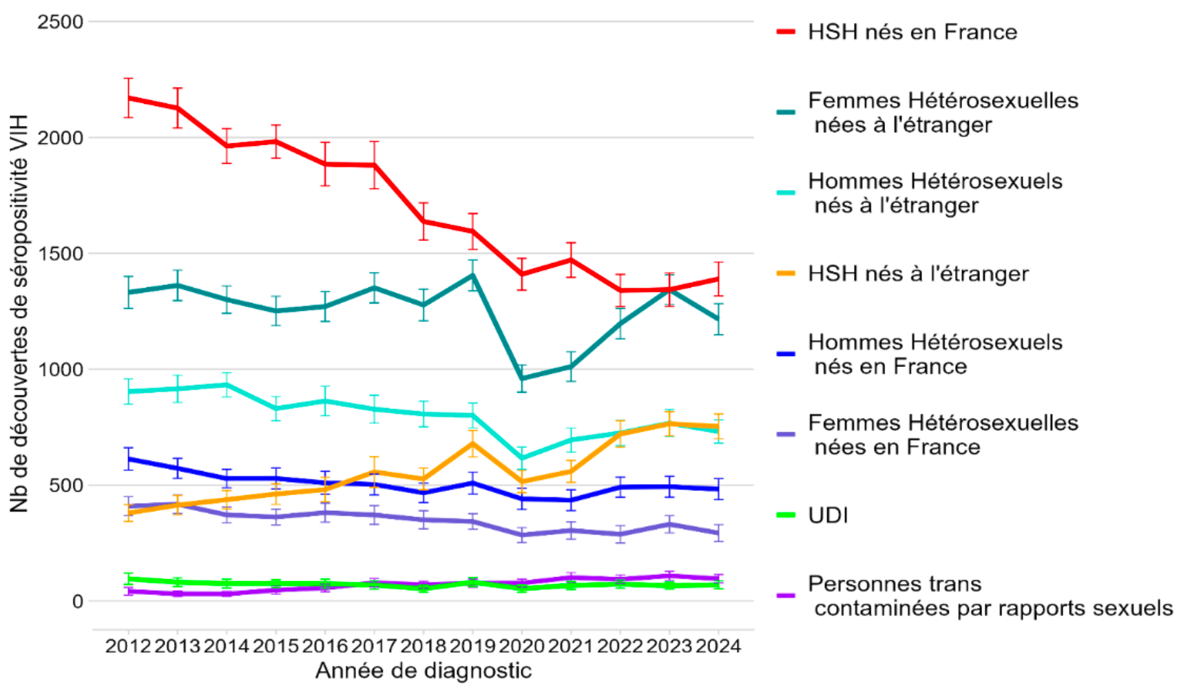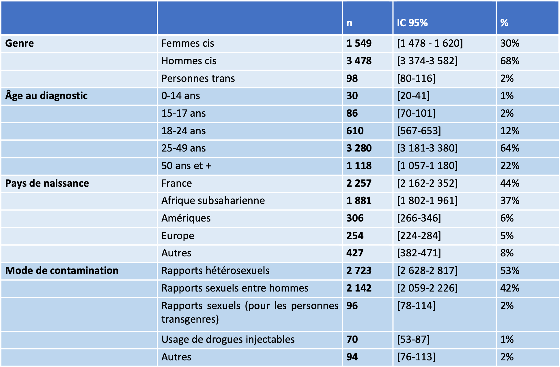 La répartition des nouvelles découvertes fait ressortir la part dominante des hommes cis (68%) et, parmi eux, des HSHHSH Homme ayant des rapports sexuels avec d'autres hommes. (42%), des personnes nées hors de France (56% dont 37% en Afrique subsaharienne), des adultes de 25 à 50 ans (64%), et peu nombreux, 2% de personnes trans et 1% d’usagers de drogue.