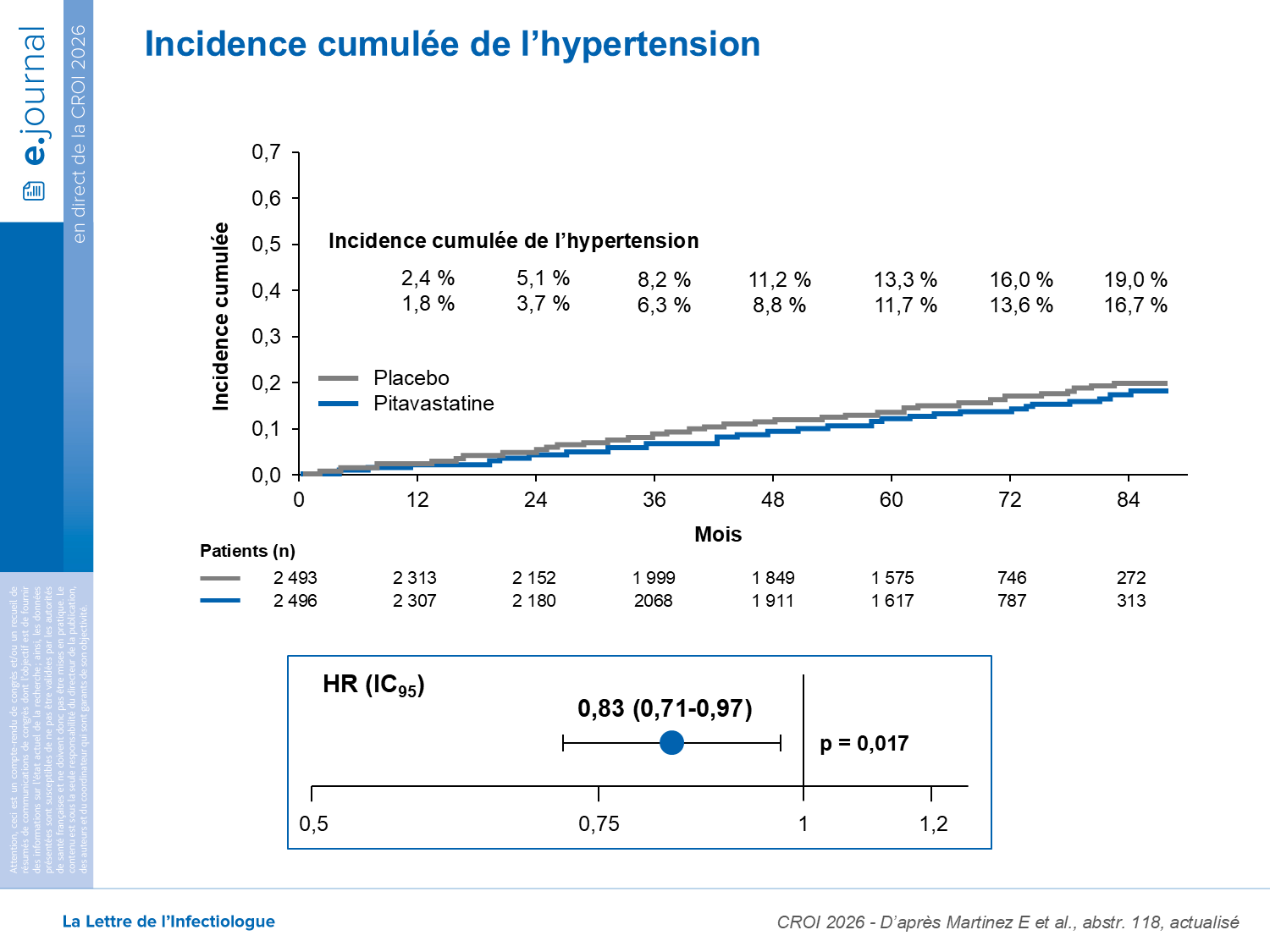 La pitavastatine réduit le risque d’HTA de 17% par rapport au placebo (HR= 0,83) et ceci quelques soit les sous-groupes (age, sexe, région d’origine, ethnie, tabagisme et indice de masse corporelle). L’hypertension incidente était associée à un risque plus que doublé de MACE (HR ≈2,1), indépendamment du traitement.
