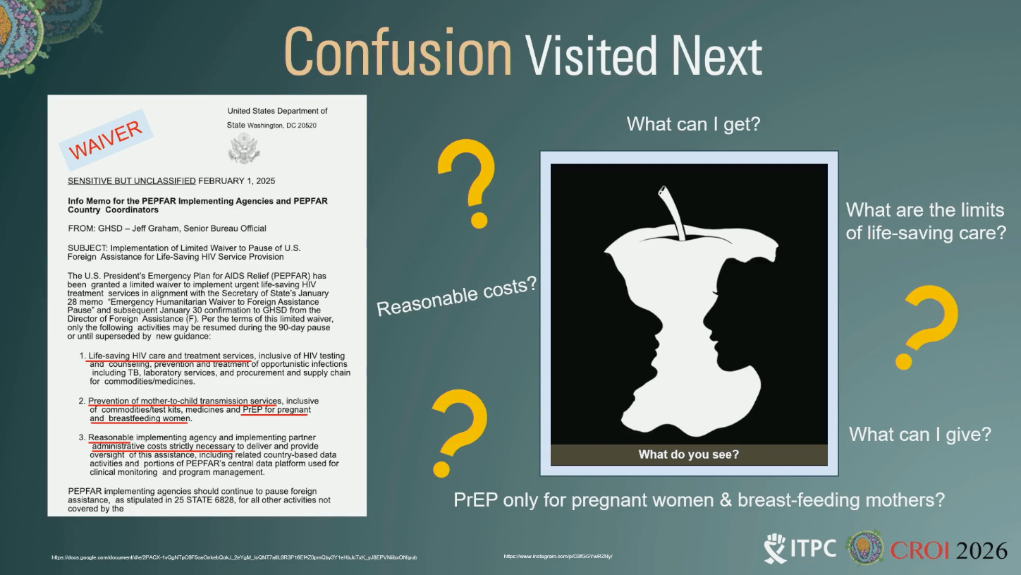 La minilecture #1051 de Ellen Brazier a enfoncé le clou avec son en enquête internet conduite entre juin à juillet 2025, auprès de 92 cliniques VIH et 11 programmes VIH. Les domaines couverts par l’enquête comprenaient les perturbations liées au financement du gouvernement américain, dans la prestation des services liés au VIH, la disponibilité des médicaments essentiels, les services de laboratoire et le fonctionnement des cliniques. Des réponses ont été reçues de 68 cliniques (74%) et 8 programmes (73%) dans 32 pays d’Afrique subsaharienne, d’Amérique latine et d’Asie-Pacifique. Dans ces contextes, près d’un tiers des répondants ont signalé des perturbations dans le conseil et le dépistage du VIH, et 18 à 27% ont signalé des perturbations dans la fourniture de la PrEP, des services de traitement du VIH, des services pédiatriques liés au VIH, de la prévention de la transmission mère-enfant, des tests de charge viraleCharge virale La charge virale plasmatique est le nombre de particules virales contenues dans un échantillon de sang ou autre contenant (salive, LCR, sperme..). Pour le VIH, la charge virale est utilisée comme marqueur afin de suivre la progression de la maladie et mesurer l’efficacité des traitements. Le niveau de charge virale, mais plus encore le taux de CD4, participent à la décision de traitement par les antirétroviraux. du diagnostic précoce chez les nourrissons, et 26% ont signalé des ruptures de stock de traitements antirétroviraux.