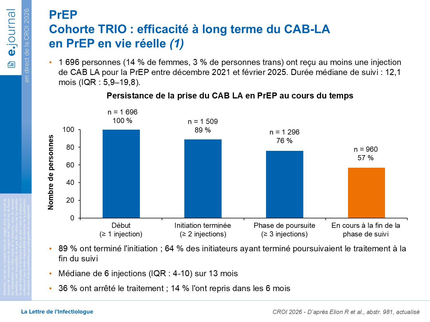Cohorte TRIO : efficacité à long terme du CAB-LA en PrEPPrEP Prophylaxie Pré-Exposition. La PrEP est une stratégie qui permet à une personne séronégative exposée au VIH d'éliminer le risque d'infection, en prenant, de manière continue ou «à la demande», un traitement anti-rétroviral à base de Truvada®. en vie réelle