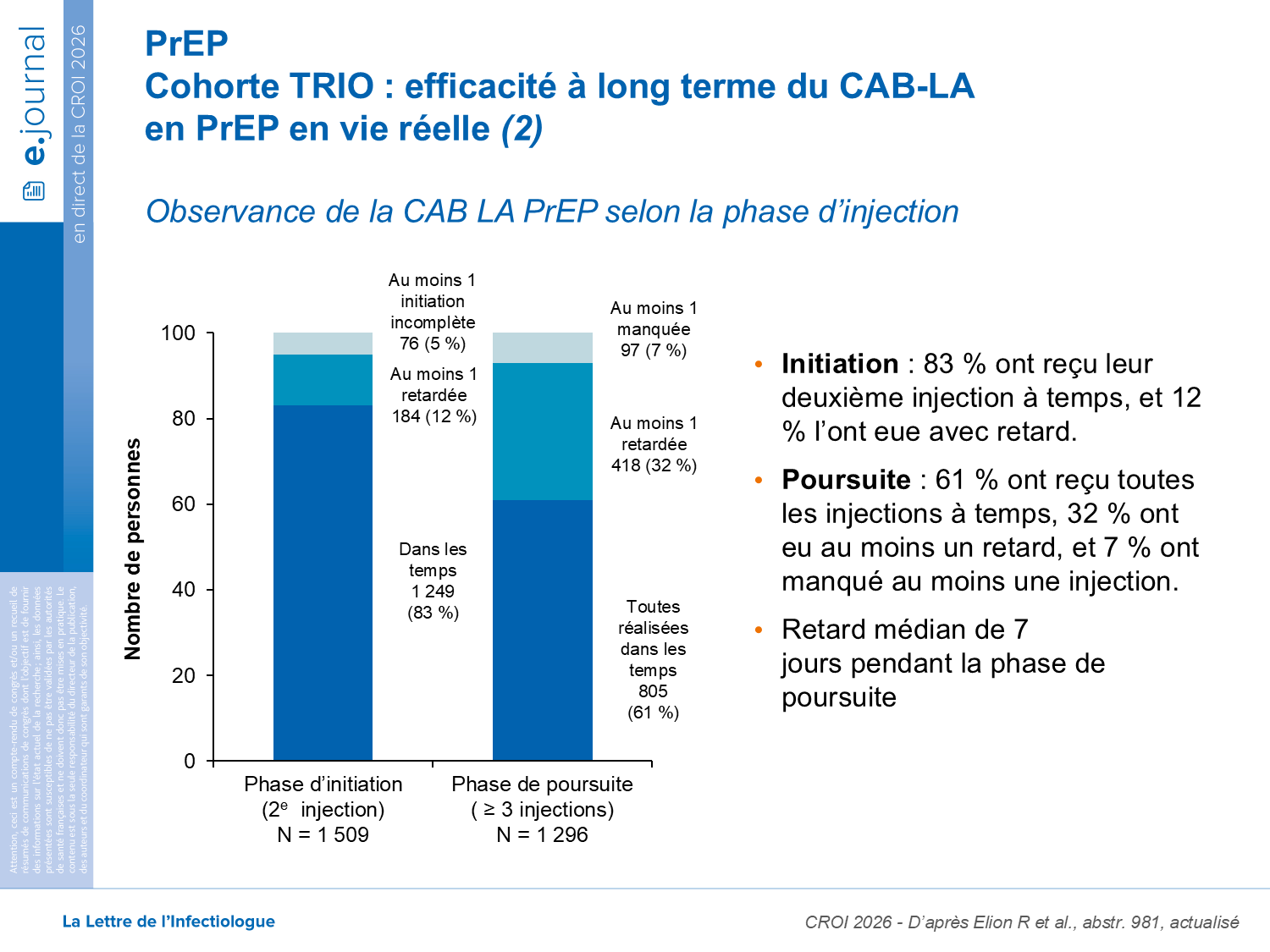 - 32 % ont présenté des retards (médiane: 1 injection ; IQR : 1–2) avec un retard médian de 7 jours (IQR : 3–17);