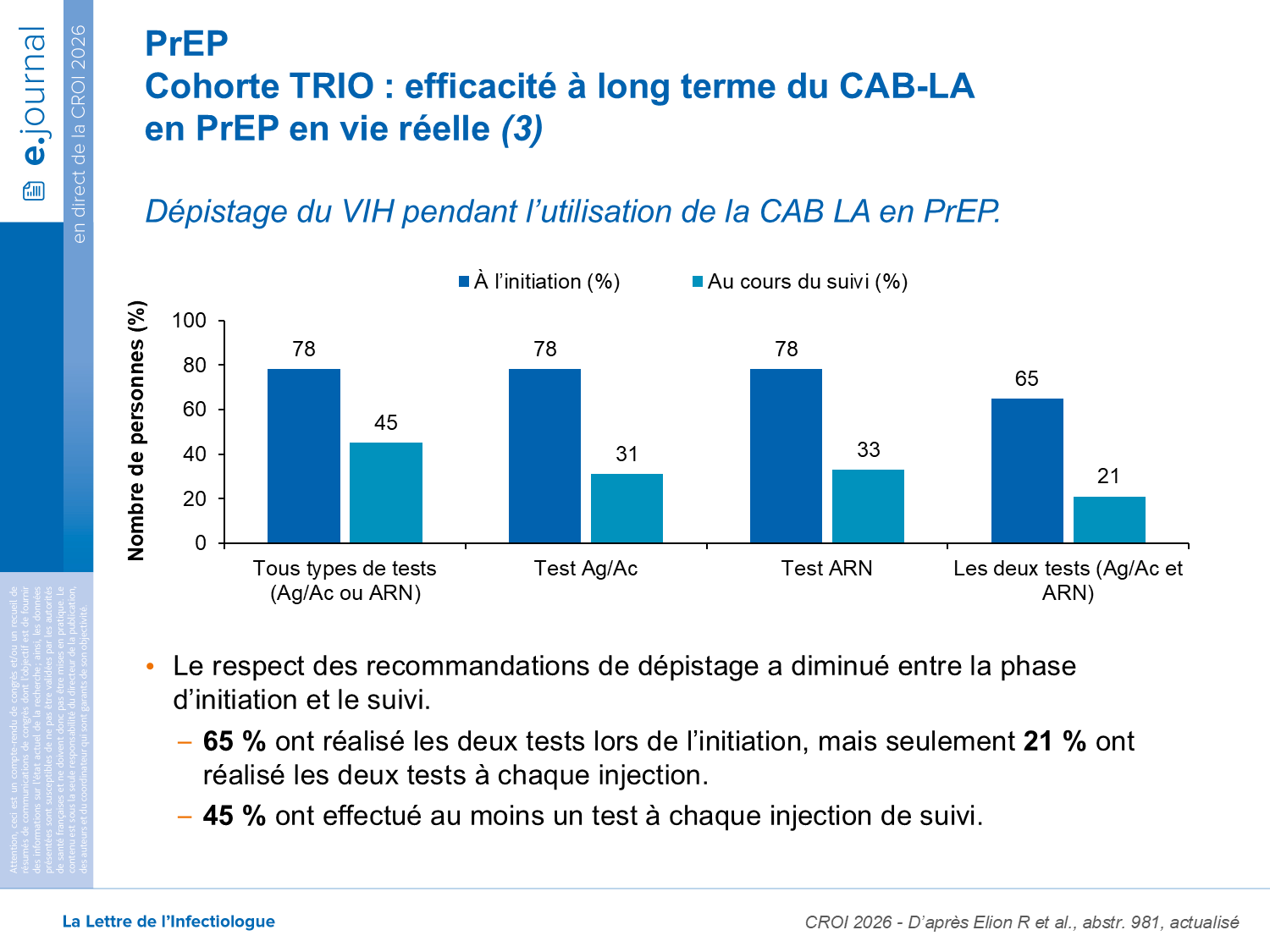 Parmi les 1696 personnes (dont 14% de femmes et 3% de personnes trans) ayant reçu des injections de CAB-LA en PrEP, 78% ont bénéficié d’un test ARN VIH, 78% d’un test combiné antigène/anticorps (Ag/Ac) et 65% des deux tests avant l’initiation. Au cours du suivi, 21% ont réalisé les deux tests, 45% au moins un des deux tests, et 5% n’ont pas systématiquement bénéficié d’un test lors de toutes les injections reçues.
