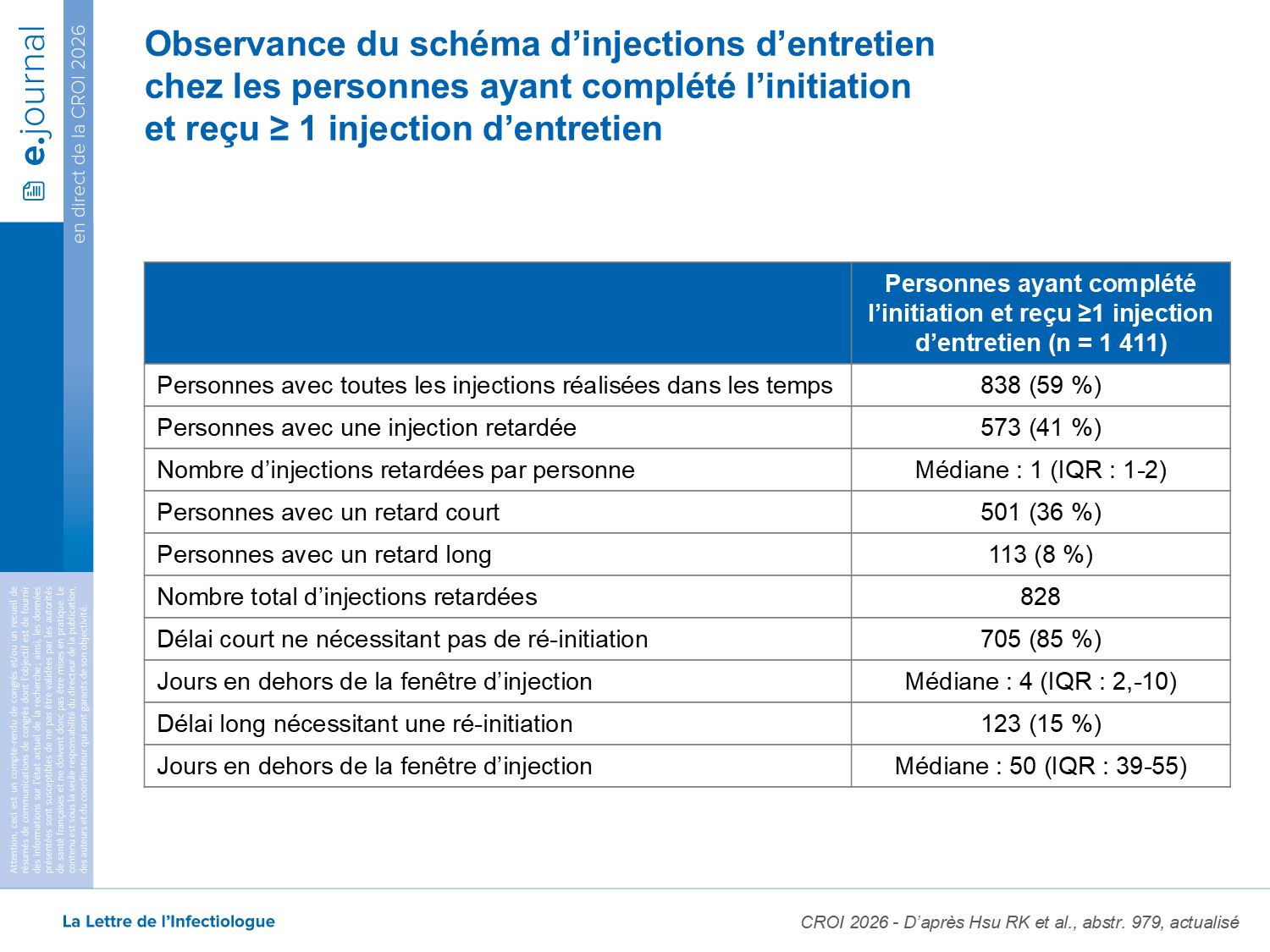 Au total, 1748 adultes ont reçu au moins une injection de CAB LA et 1547 (89%) ont complété la phase d’initiation. La durée médiane de suivi était de 13,3 mois (IQR: 9,2–18,8). Parmi les 1411 personnes ayant reçu au moins une injection de continuation: 838 (59%) ont reçu toutes les injections à temps et 573 (41%) ont au moins une injection retardée. La majorité (85%) des retards étaient courts (médiane: 4 jours au-delà de la fenêtre cible) et probablement sans impact majeur sur la protection, mais 15% ont nécessité de recommencer le schéma d’initiation.