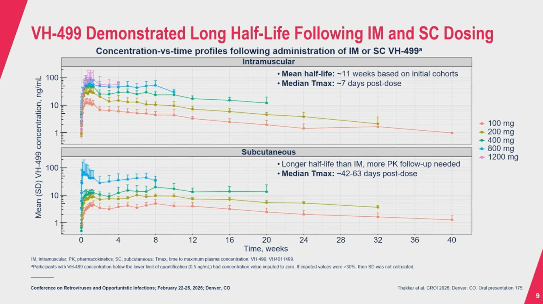 Sur le plan pharmacocinétique, l’absorption est nettement plus lente en sous-cutané, avec un Tmax autour de 112 jours, contre 7 à 18 jours en intramusculaire. Les pics de concentration sont plus faibles en sous-cutané, mais avec une élimination extrêmement lente, empêchant pour l’instant d’estimer la demi-vie terminale. Ces premiers résultats suggèrent un potentiel d’administrations très espacées, possiblement ≥4 mois. Les prochaines étapes reposeront sur des données PK avec plus de recul et une modélisation pour optimiser le schéma et la stratégie de développement. Le choix se fera alors pour les essais suivants sur la dose et les modalités d’administration.
