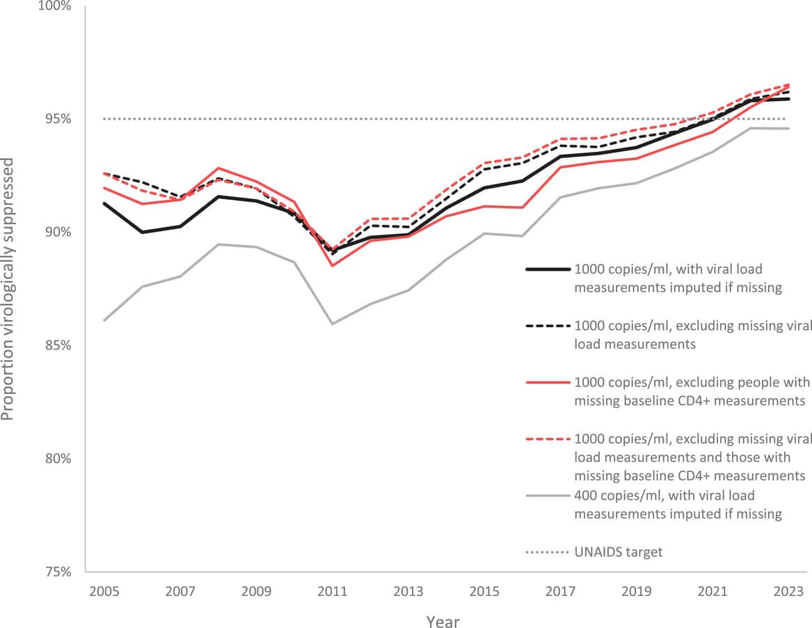 C’est dans ce contexte qu’une équipe de chercheurs sud-africains et internationaux, coordonnée par Haroon Moolla (Université du Cap), a analysé les données de sept cohortes de la collaboration IeDEA-Afrique australe (International epidemiology Databases to Evaluate AIDS), couvrant la période 2005-2023. Donc avant le gel du PEPFAR et le blocage de USAID par l’administration Trump dont les effets sur l’Afrique du Sud ont été modélisés (Lire notre article : Réduction du financement PEPFAR : l’alerte des chercheurs). Les résultats ont été publiés en janvier 2026 dans le Journal of the International AIDS Society, et montre que la suppression virale a augmenté au fil du temps, pour atteindre 95,9% en 2023.